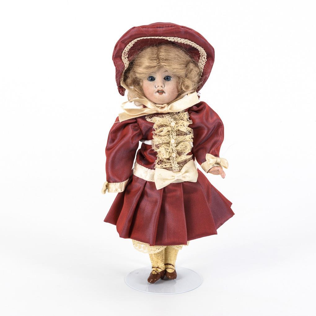 Kurbelkopf, blaue Schlafaugen, blonde Mohairperücke. 5-teiliger Stehpuppenkörper mit modellierten Schuhen und Strümpfen. Weinrotes Kleid mit passendem Hut. Kopf nicht durchleuchtet, Lider defekt.