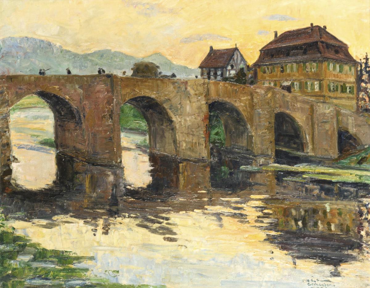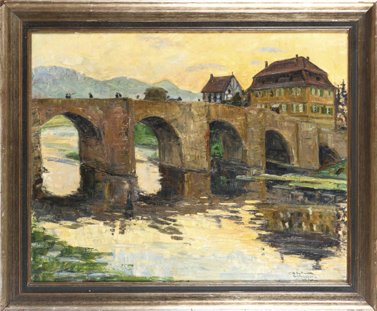 Undeutlich signiert: Flusslandschaft mit steinerner Brücke