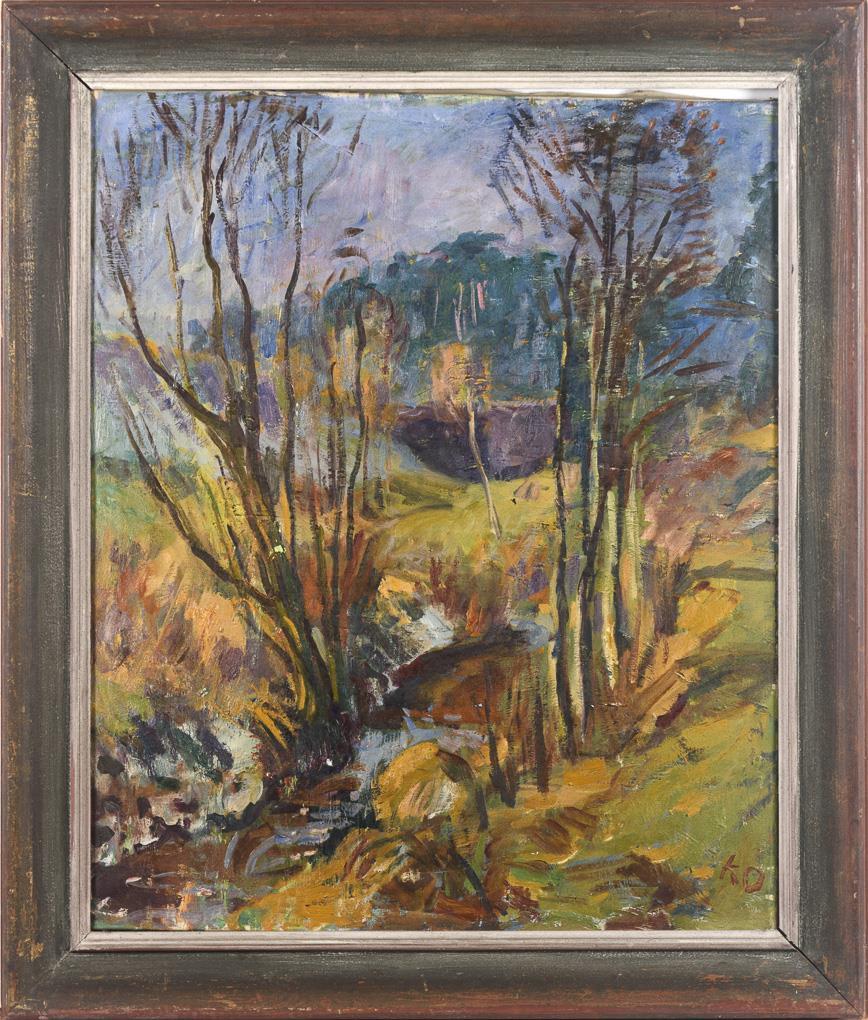 Expressive Landschaft mit kahlen Bäumen am Bachufer vor einem Wald.