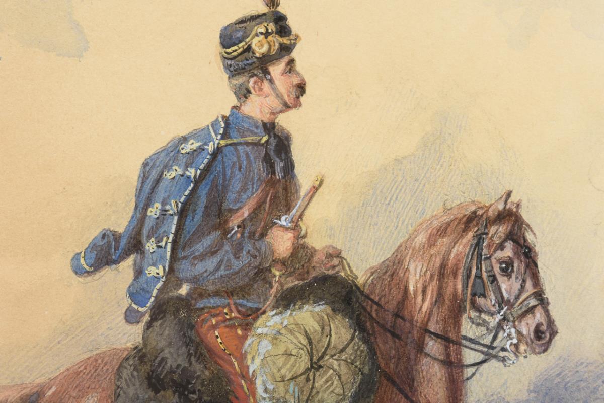 Der Reiter in blau-roter Uniform in hügeliger Landschaft.
