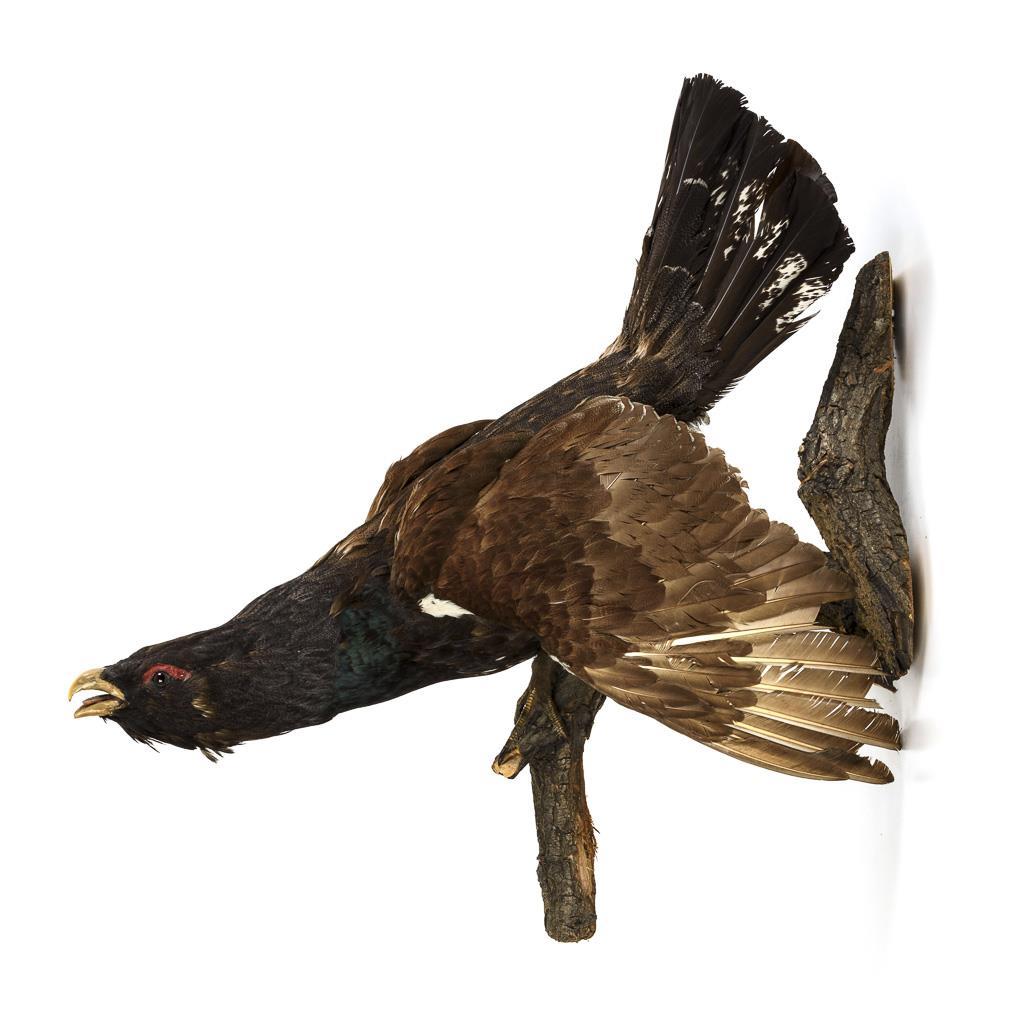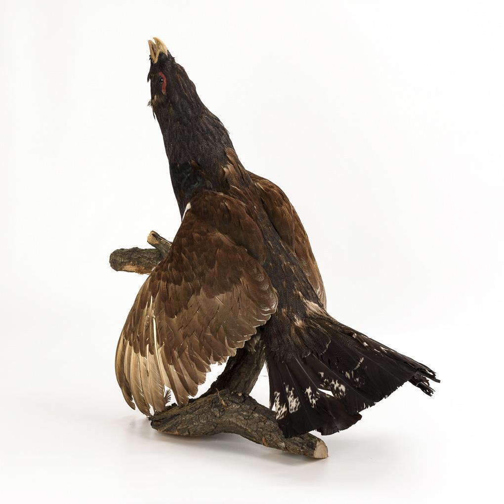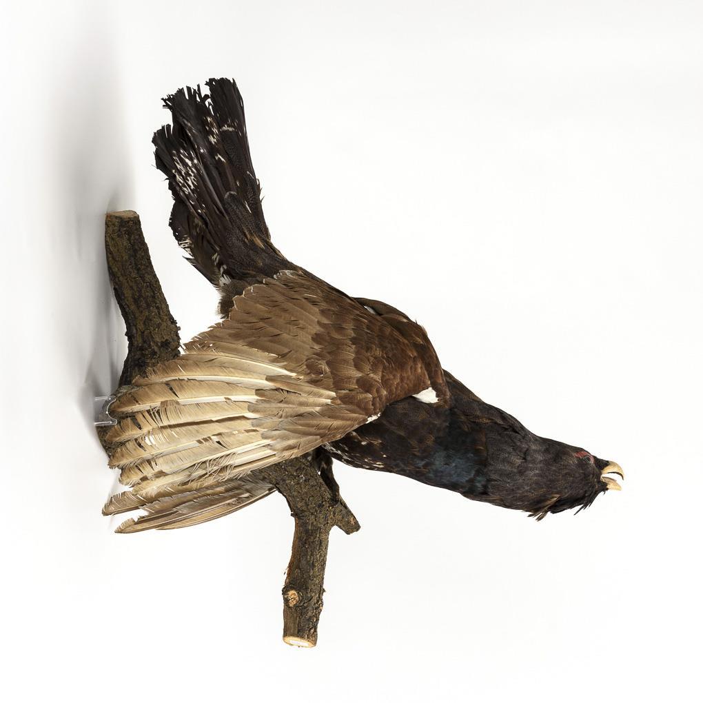 Prächtiger kollernder Auerhahn auf einem Ast für die Wandmontage. Alters-/Gebrauchsspuren.