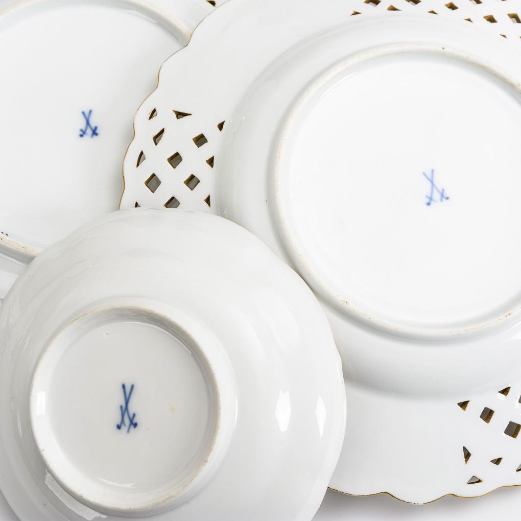2 Durchbruchteller (Ø 20,5 cm), Kaffeekanne (H 23,5 cm), 1 Blattschale (L 19,5 cm), 1 Tasse und 2 Untertassen. Bestoßung am Rand der Blattschale und am Rosenknauf.