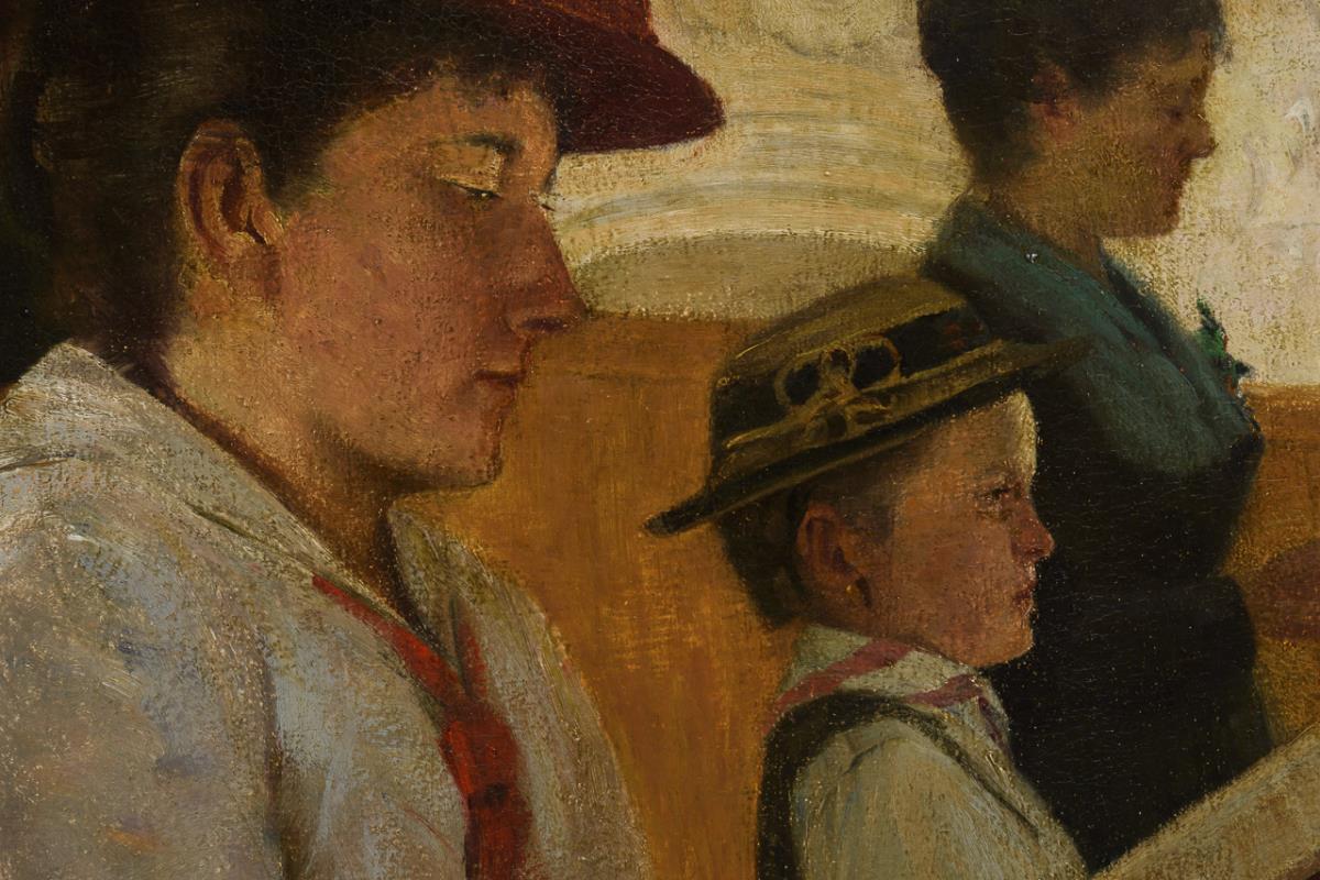 Mehrere Personen, teils in Gedanken versunken, auf den Kirchenbänken vor der Orgel. Eine sehr kleine restaurierte Stelle.