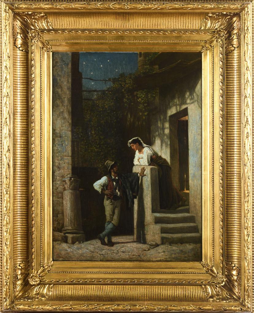 Junger Mann im hellen Schein des Vollmondes im Gespräch mit einer jungen Frau am Eingang eines Hauses. Leichte Altersspuren.
