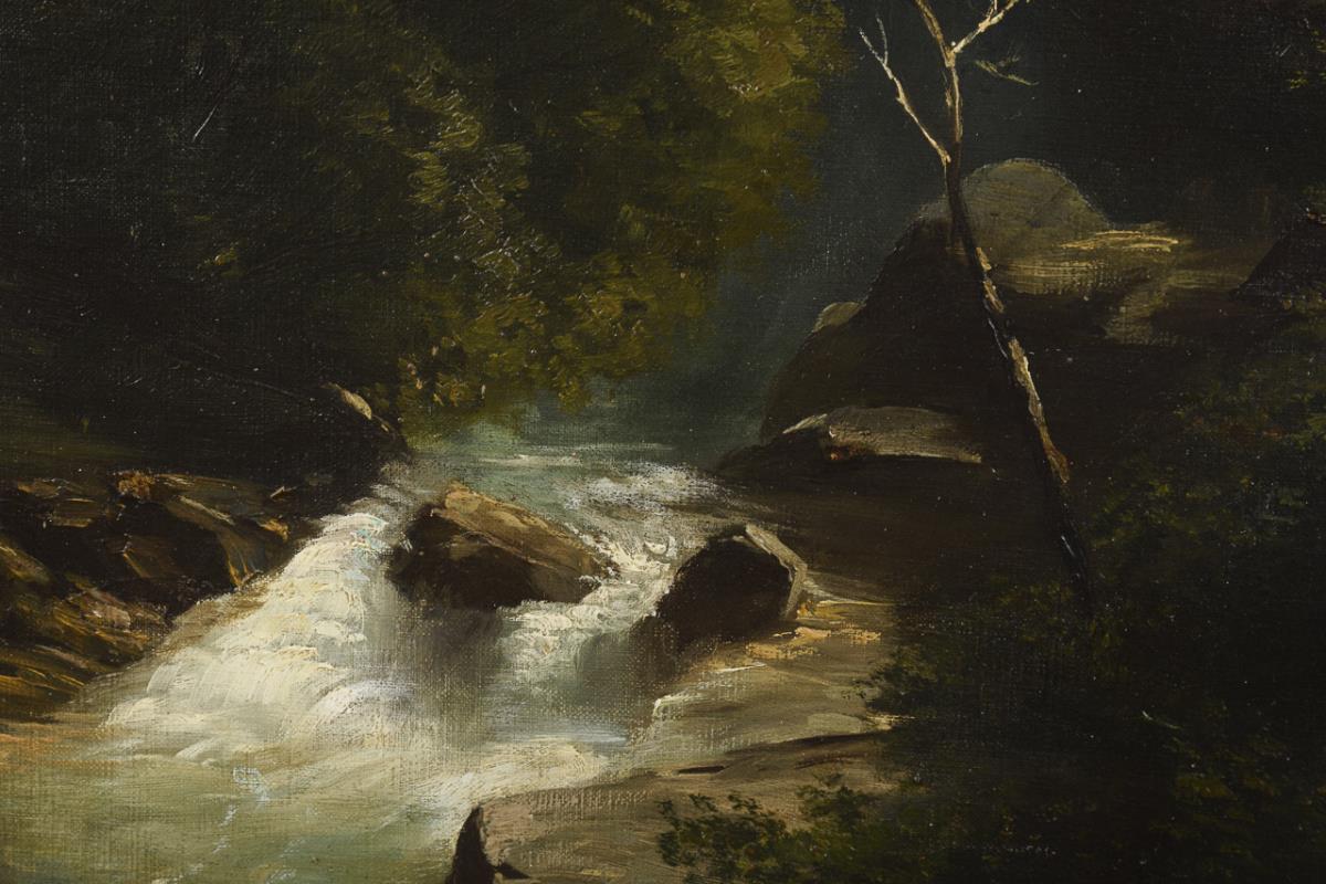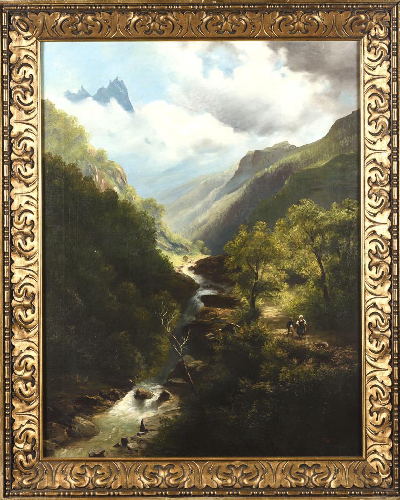 Staffagefiguren auf einem Weg entlang des Flusses zwischen den Berghängen.