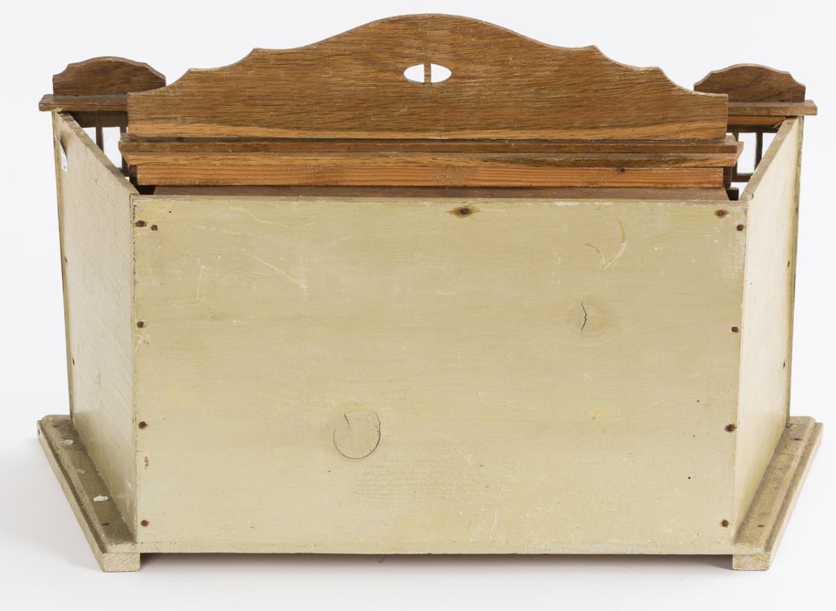 Trapezförmiges Gehäuse, alt tapeziert, Fußbodenpapier in Fliesenoptik. An der Front 2 Schaufenster, Ladeneinbau mit 9 niederländisch beschrifteten Schüben. Mit Waage und zahlreichem Zubehör. Kleine Defekte, muss teils neu verleimt werden.