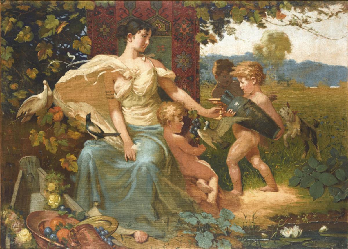 Junge Frau in antikisierender Kleidung unter Weinreben und bei einem mit Obst gefüllten Boot sowie drei Knaben, Tauben und einer Ziege.