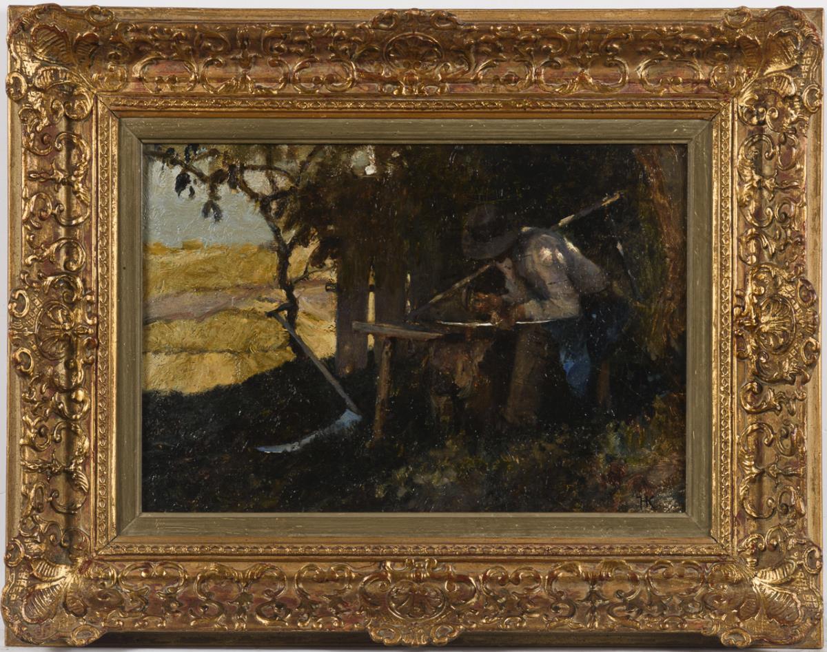 Bauer beim Dengeln der Sense