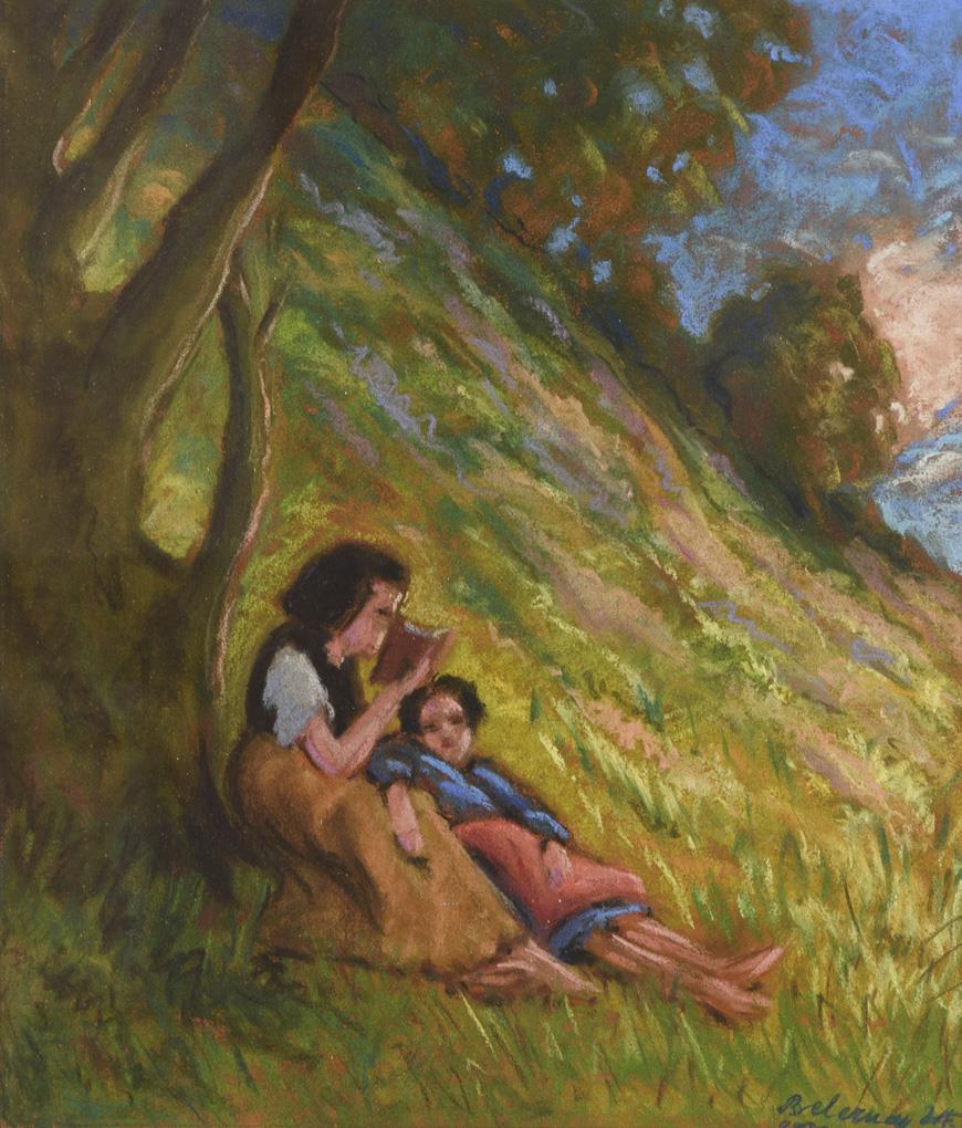 Die Mädchen unter einem Baum beim Lesen an einem Wiesenhang.