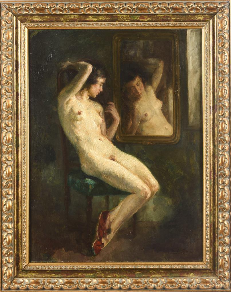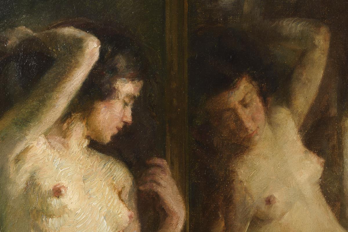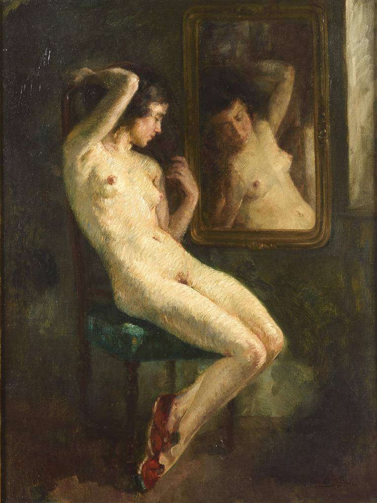 Vor einem Spiegel sitzende junge, nackte Frau.