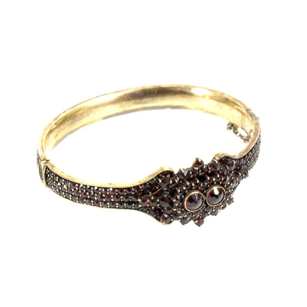 Ovaler Klappreif mit Granatbesatz. Kastenschloss mit Sicherheitskette.