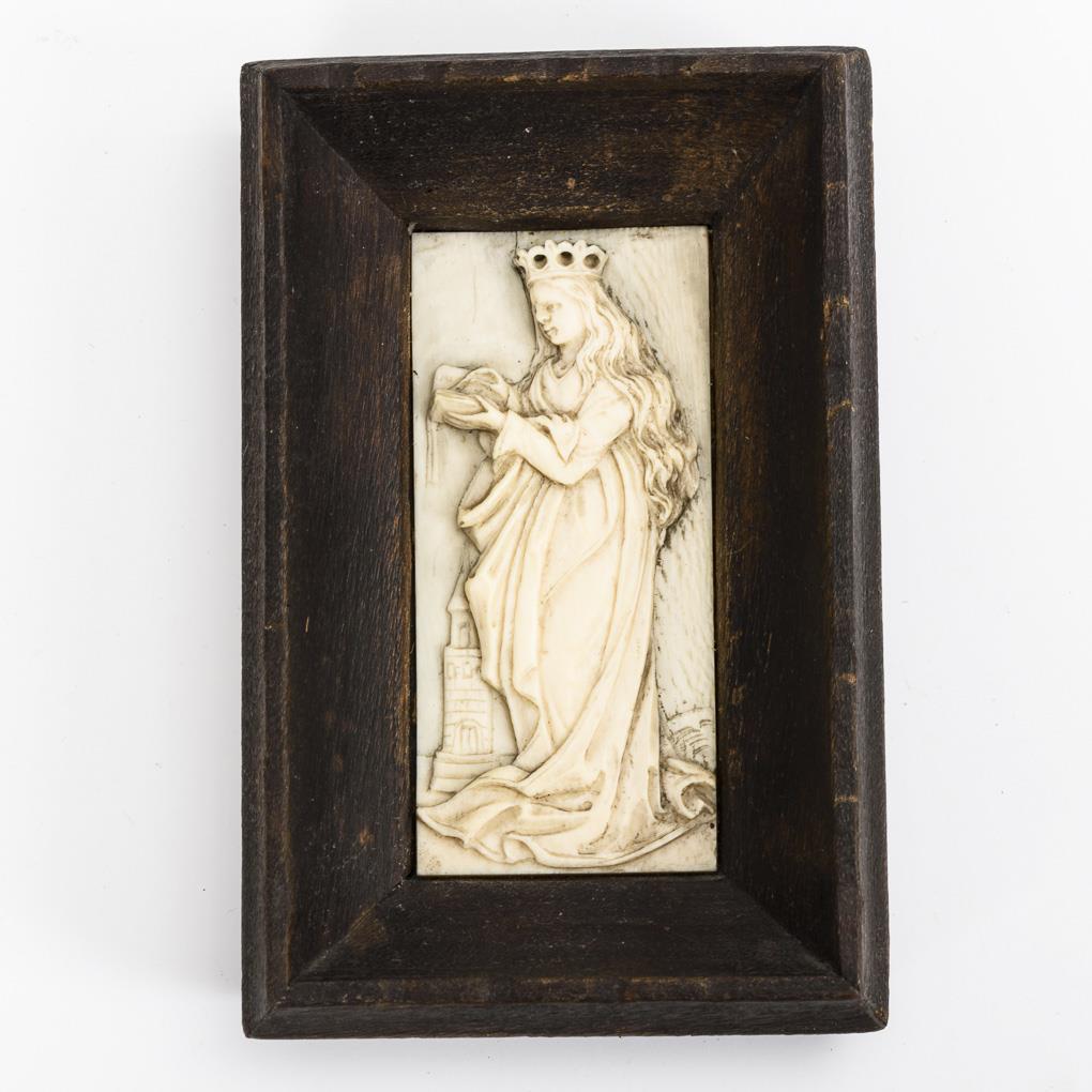 Standfigur der Heiligen mit Turm im Hintergrund. Bildnispendants zweier Frauen in Renaissance-Kostümen (Elisabeth I. und Maria Stuart?). Haarriss im Elfenbein-Hintergrund, minimale Fehlstelle an der Krone der Königin.