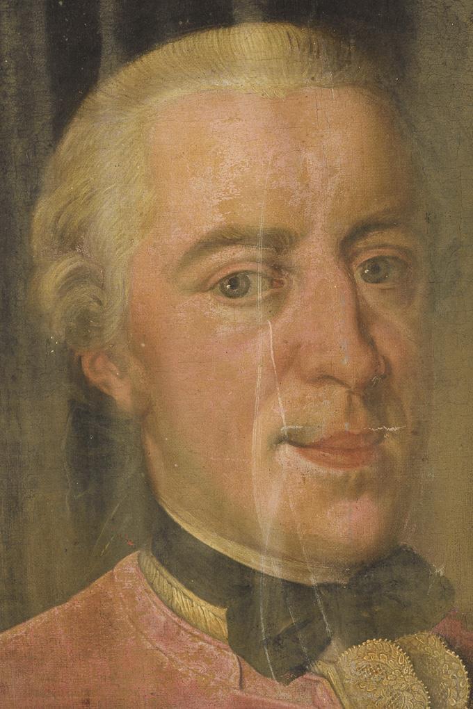 Porträt des Grafen mit weißer Zopfperücke und im roten Gehrock mit Rüschenhemd. Restaurierungsbedürftig.