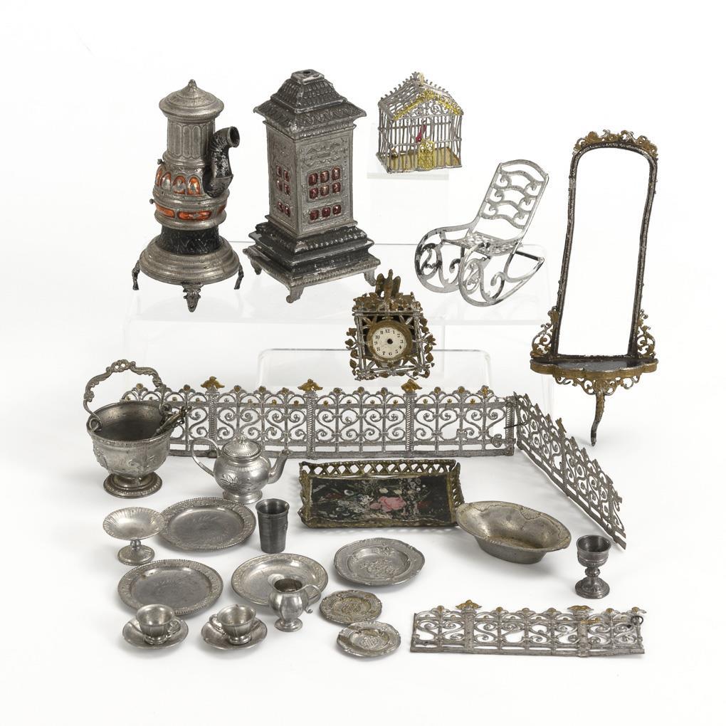 2 Öfen, Schaukelstuhl, Uhr, Vogelkäfig, Henkelschale, Tablett und Konsolspiegel-Rahmen. Dazu ca. 15 Teile Zinngeschirr und 3 Zaunteile. Teils mit Defekten, Spiegelglas fehlt.