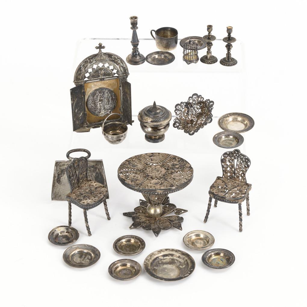 Ca. 22 Teile für die Puppenstube, darunter Tisch, 2 Stühle, Vogelkäfig, Tischaltar, Leuchter und Teller. Teils verbogen, mit kleinen Defekten.