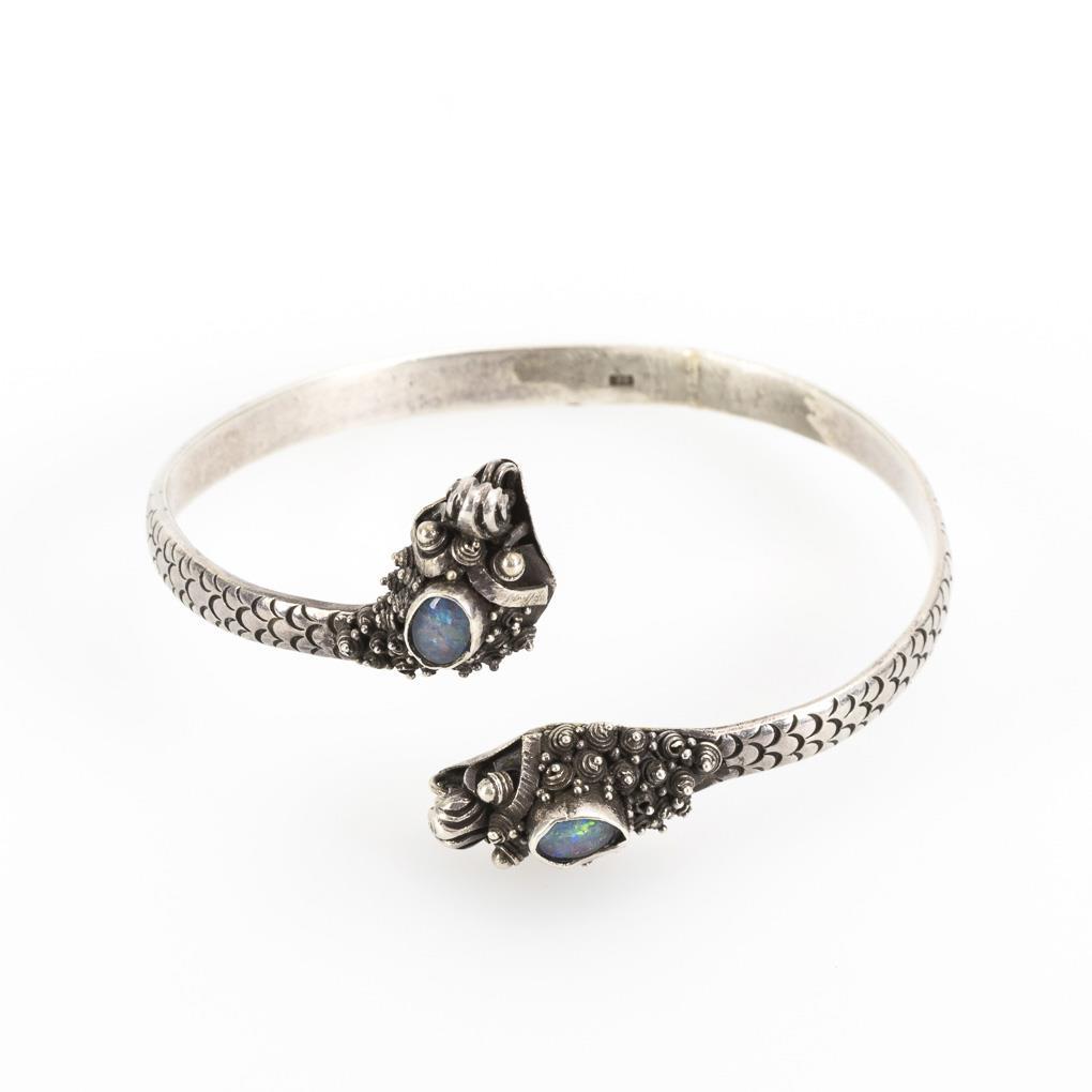 Offener Reif mit 2 Opaltripletten in plastisch gestalteten Drachenköpfen. An Unterseite kleine Lötstelle.