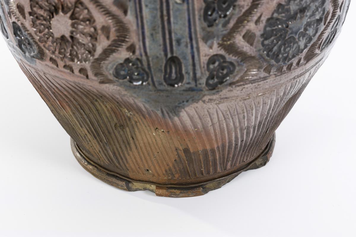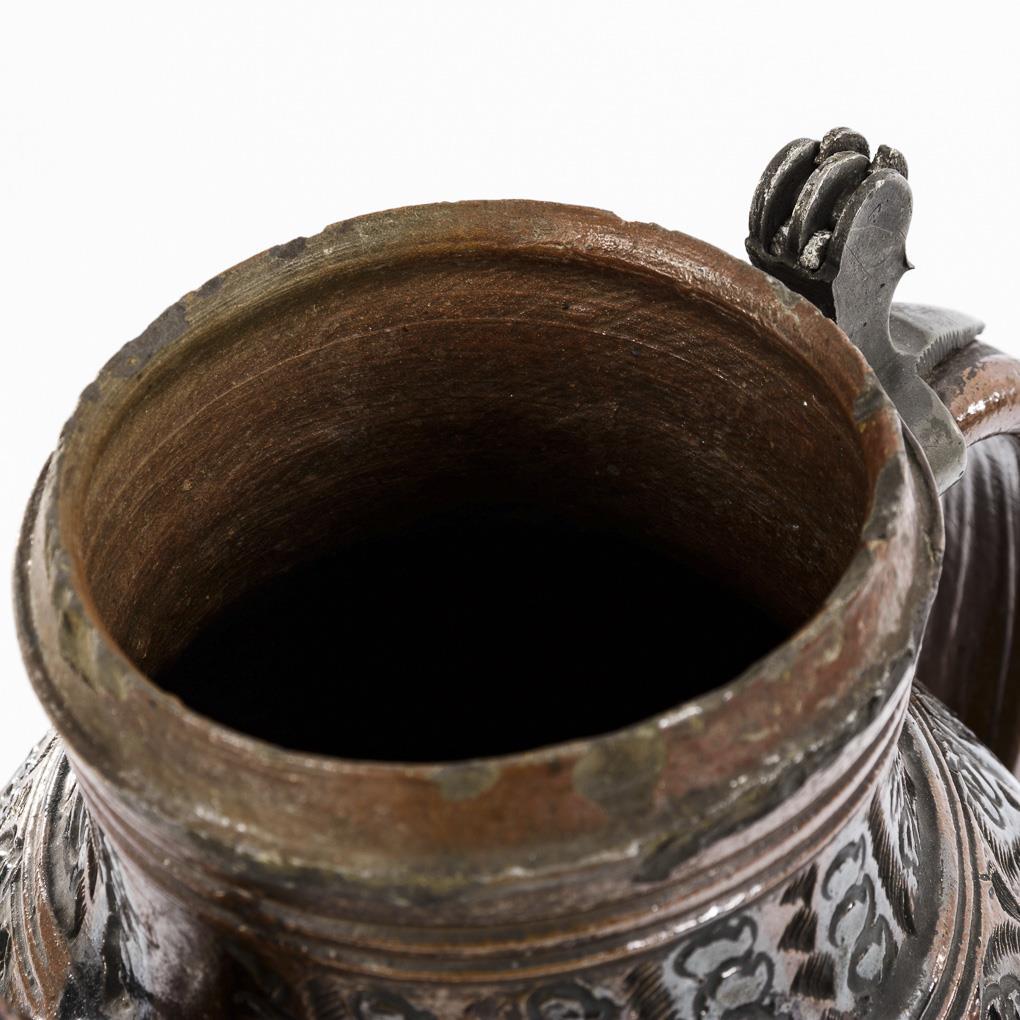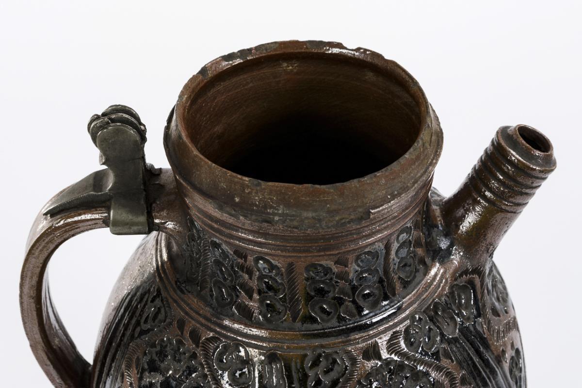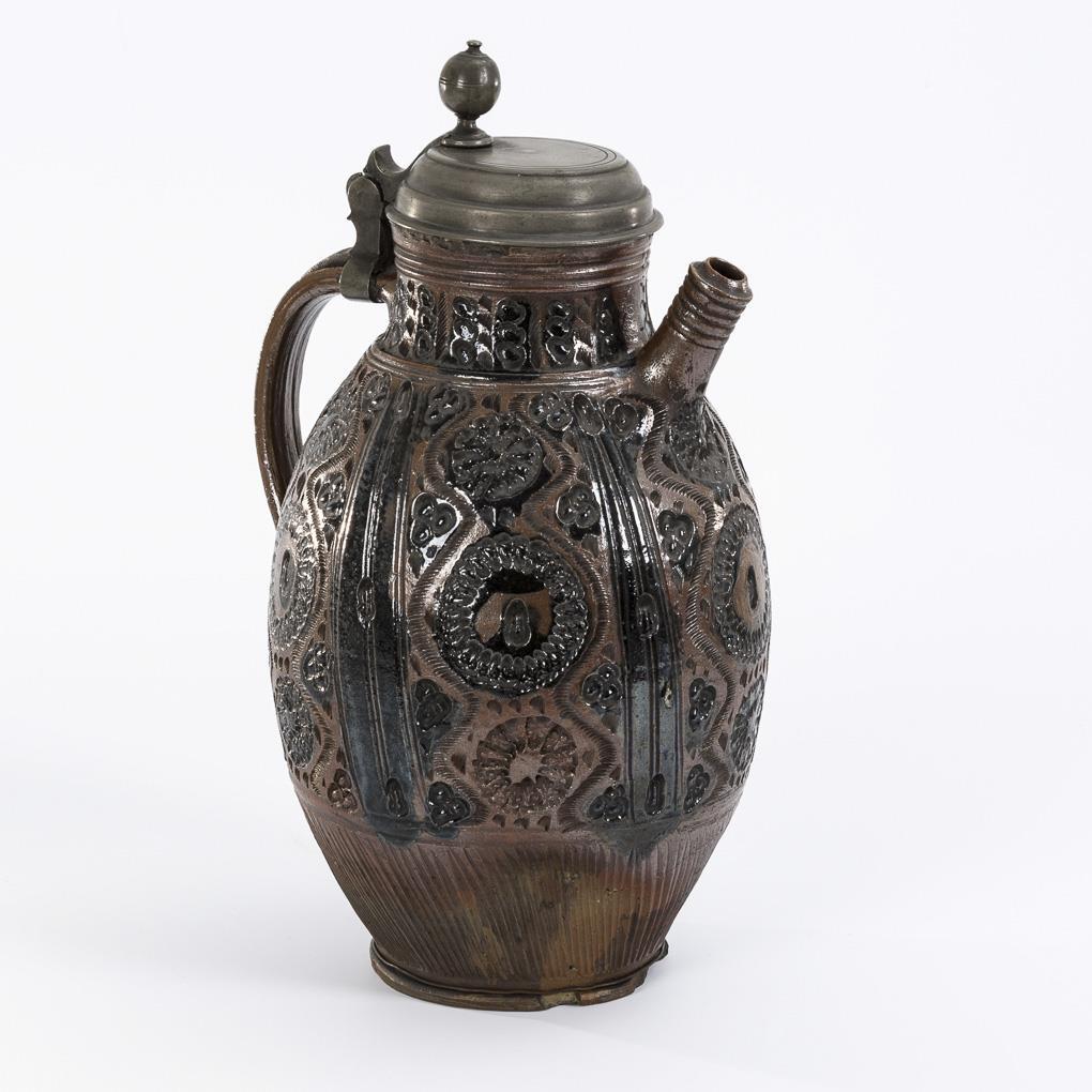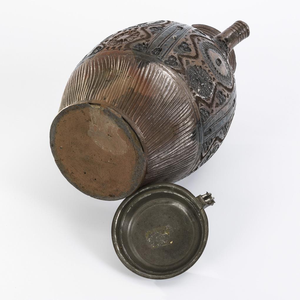 Ovoide Gefäßform mit rillenverzierter Tülle und Zylinderhals, Bandhenkel mit Daumendruck. Stempel- und Ritzdekor mit jeweils 3 großen Rosetten auf 5 Feldern, vertikalen Engobebändern und diagonalem Kerbschnitt im Standbereich. Defekte Zinnmontierung. Deckel lose, Bestoßungen, Risse.