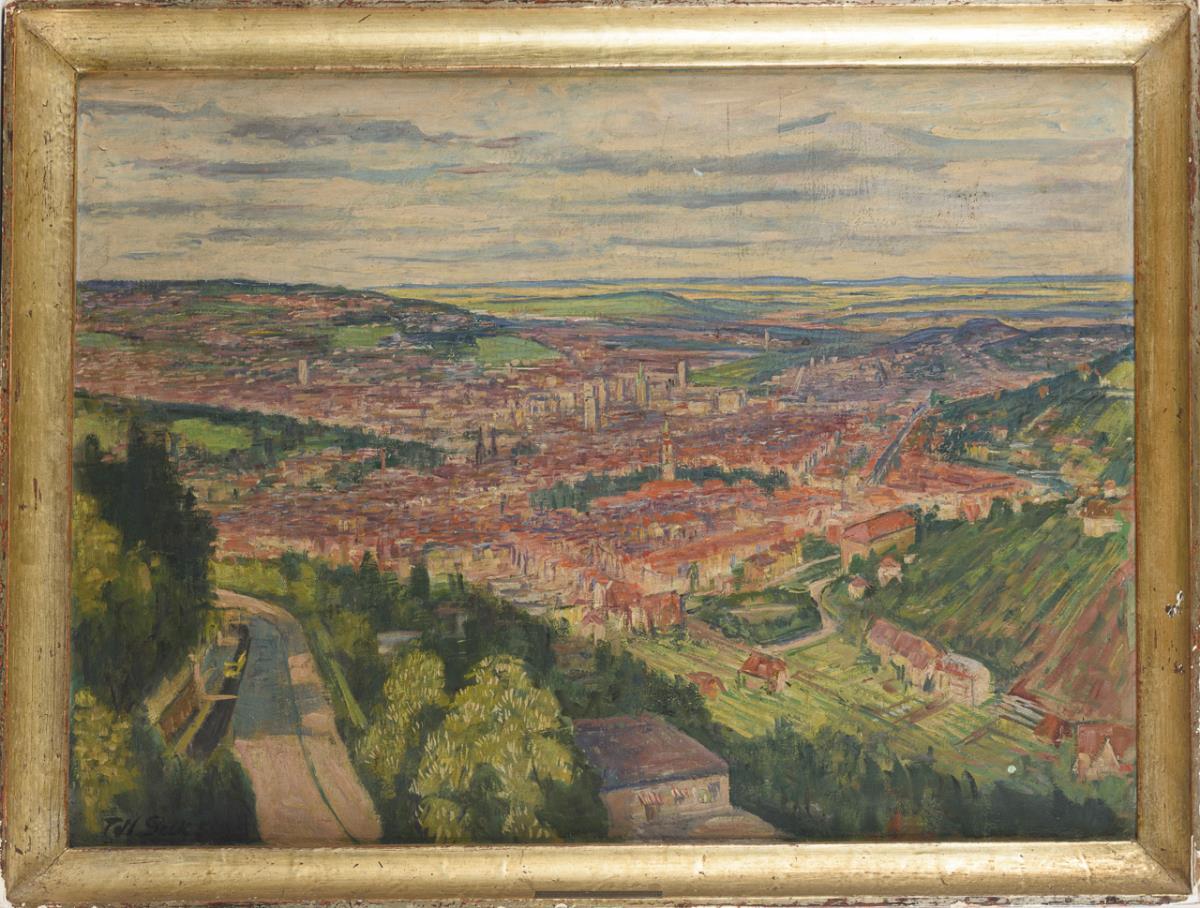 In der Art der neuen Stuttgarter Sezession gemalte Ansicht der Baden-Württembergischen Stadt im Sonnenschein. Altersspuren.
