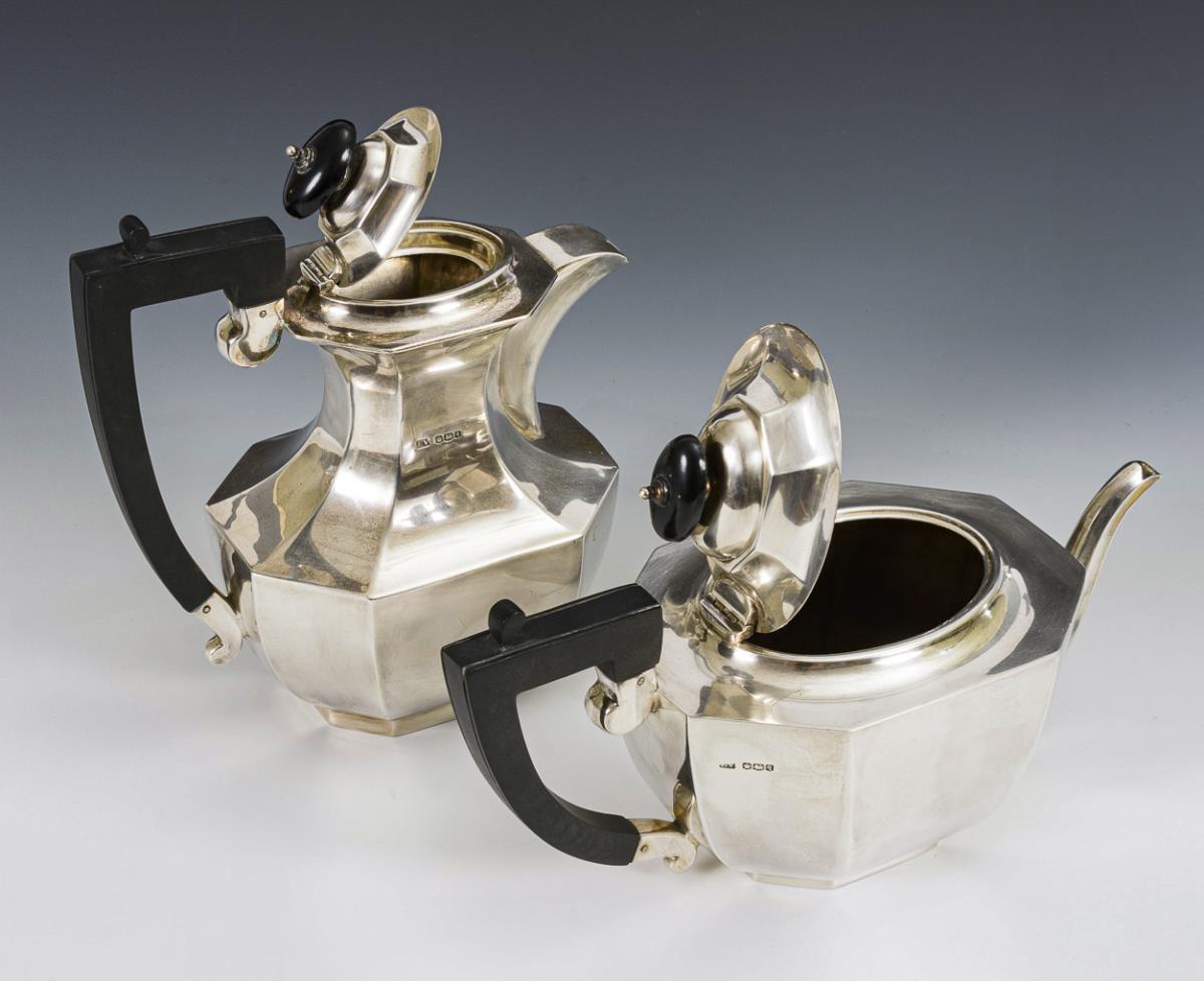 4 Teile: Kaffeekanne, Teekanne, Zuckerschale und Sahnegießer in 8-eckiger, facettierter Form mit schwarzen Knäufen und Henkeln. Leichte Gebrauchsspuren.