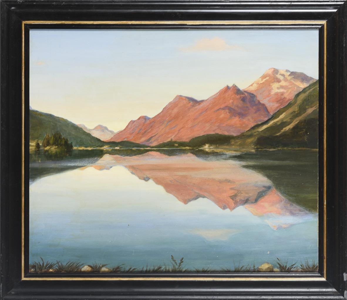 Blick über den spiegelnden See zu den orangefarben leuchtenden Bergen in der Abendsonne.