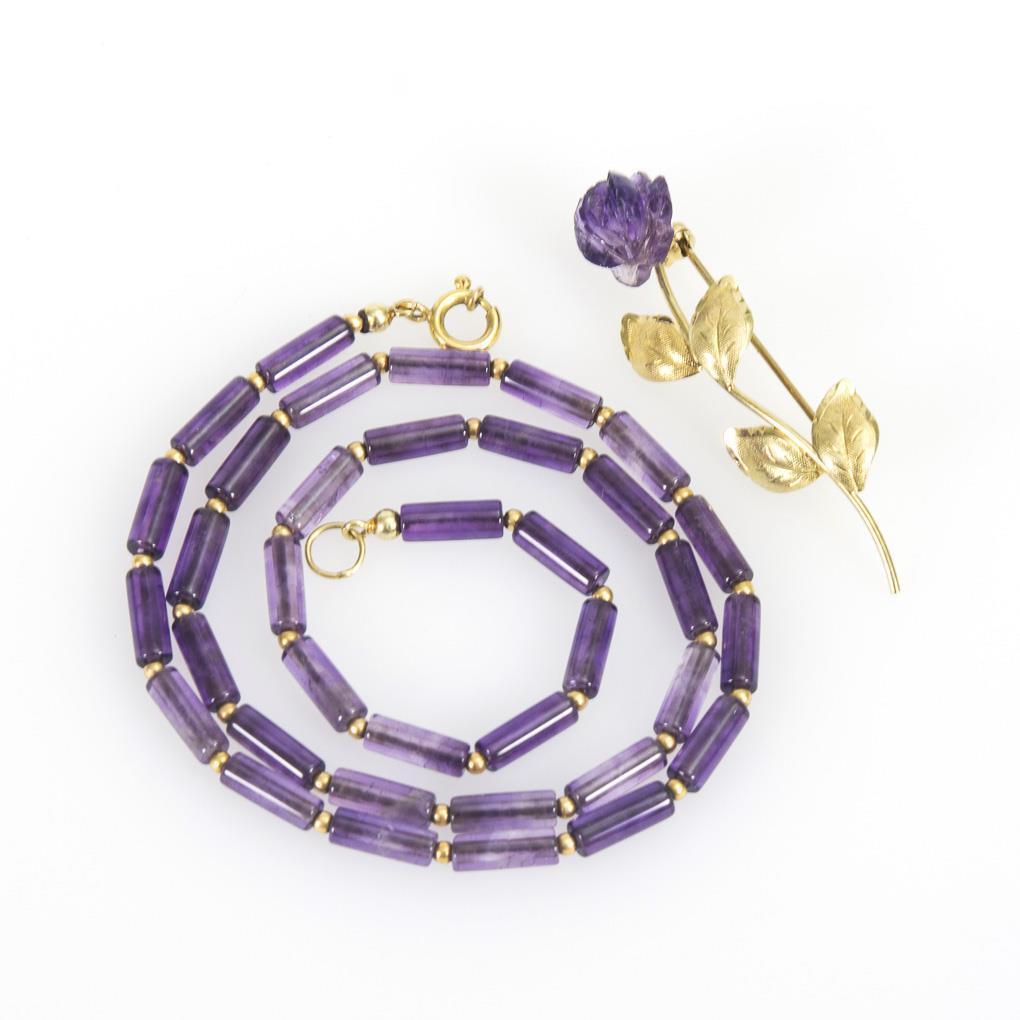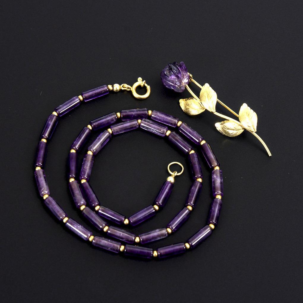 Schnürkette mit Amthyststäbchen an Ringfederschließe. Rosenbrosche mit geschnittener Amethystblüte. Kugelhaken.