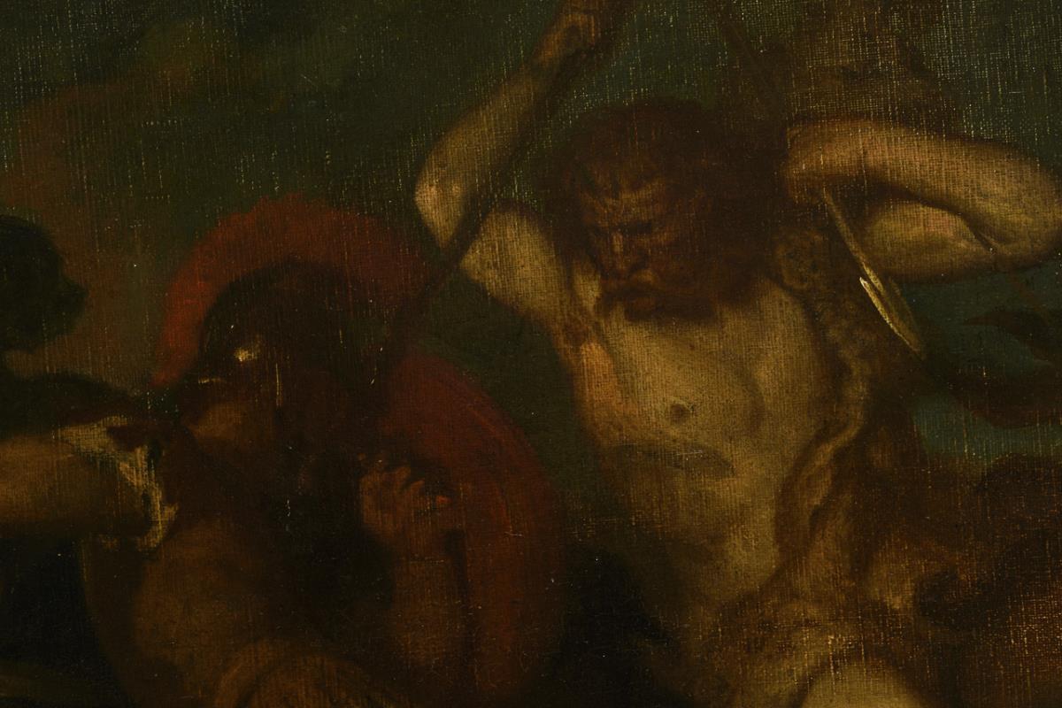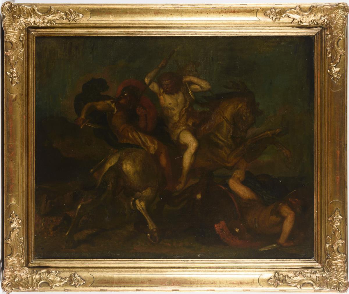 Römischer Soldat im hitzigen Gefecht mit einem Barbarenreiter an der Meeresküste. Leinwand doubliert.