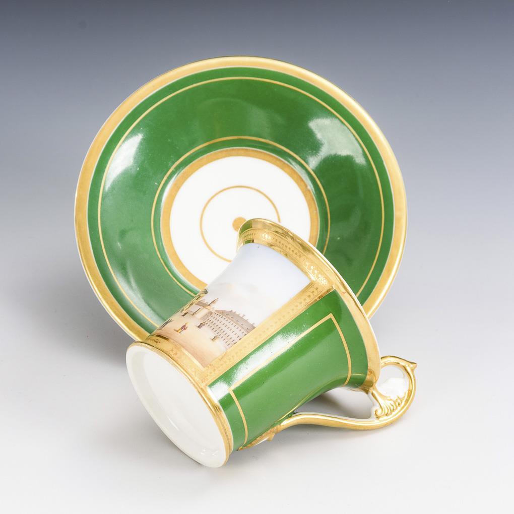 Grüner Fond, polychrome Malerei, Goldstaffage. H Tasse 9,5 cm, Ø originale Untertasse 14,5 cm.