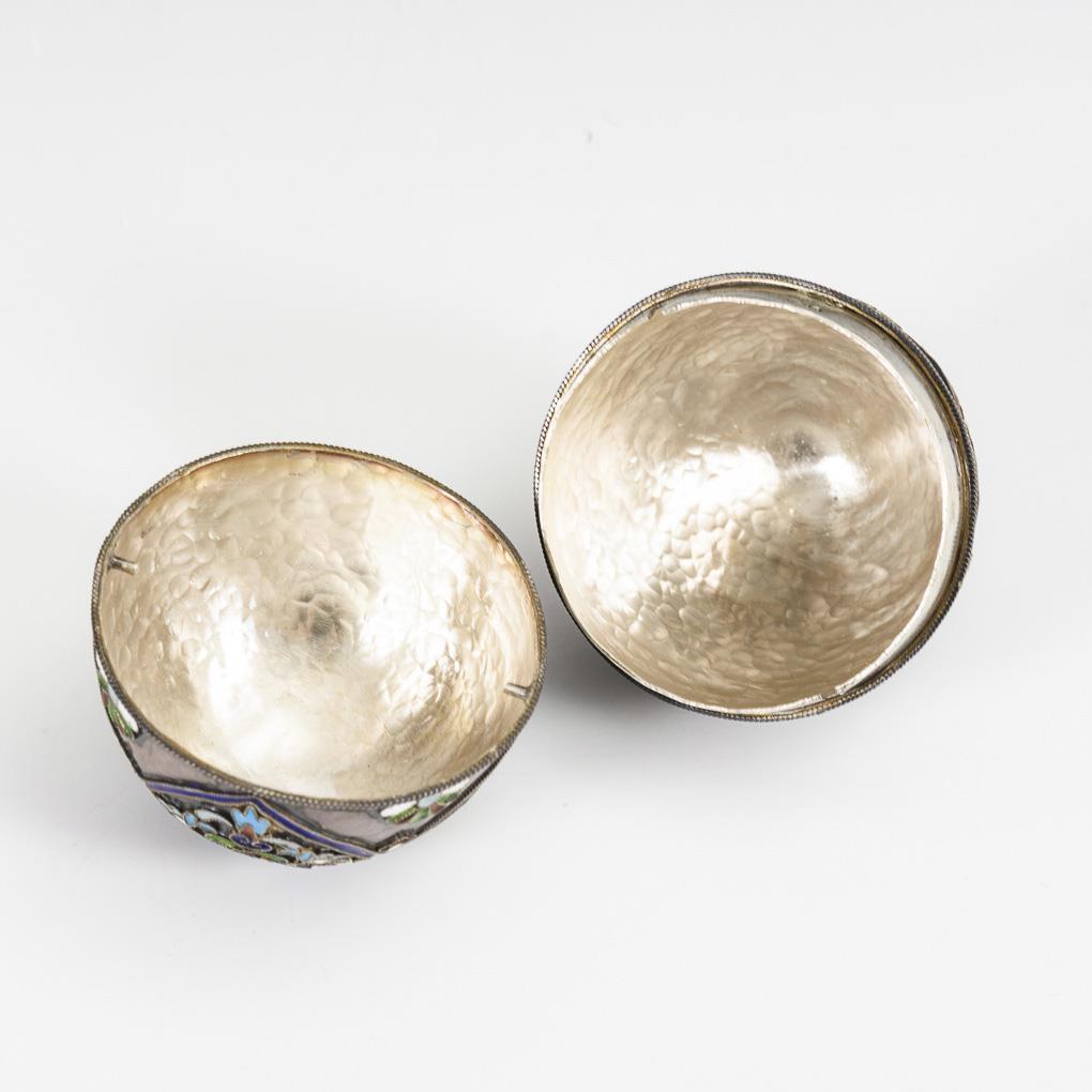 Zusammengesteckte, handgetriebene Eihälften mit vegetabilem Ornament aus farbigem Email in aufgesetzten Filigranstegen. Schachtel ergänzt.