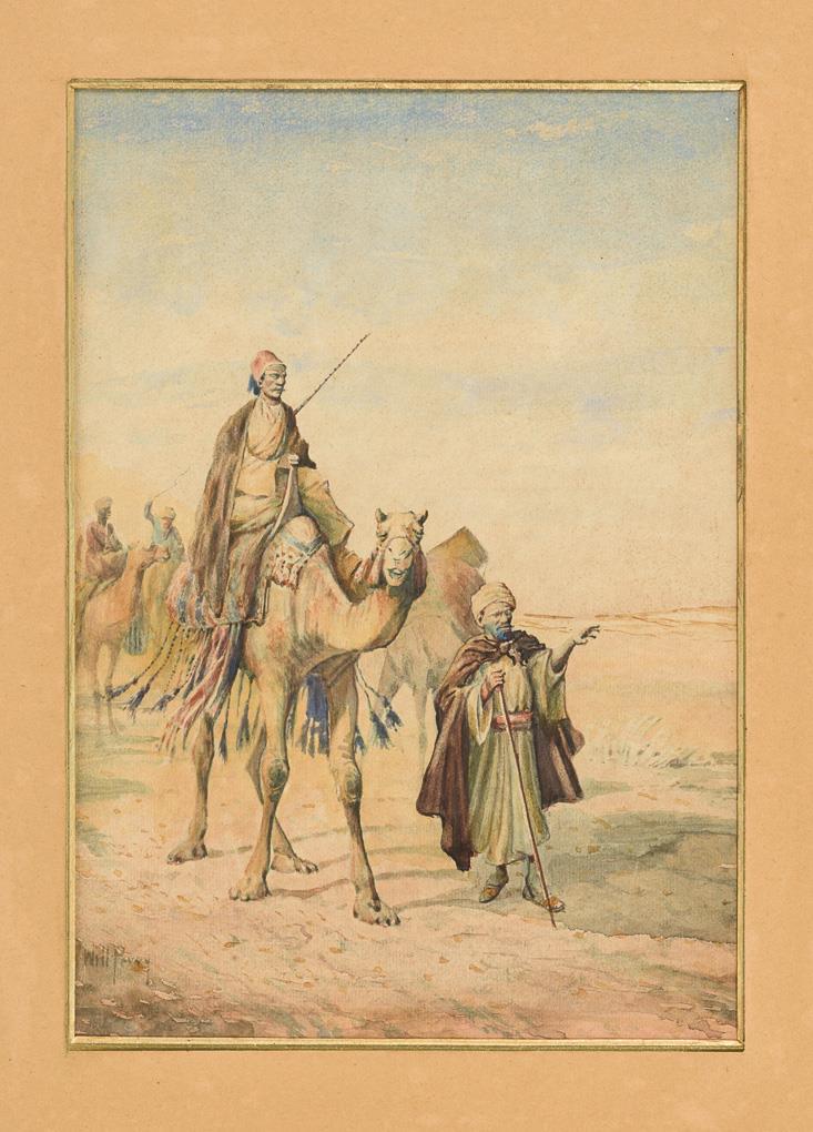 Karawane mit Führer im hellen Sonnenschein in der Wüste. Leicht vergilbt.