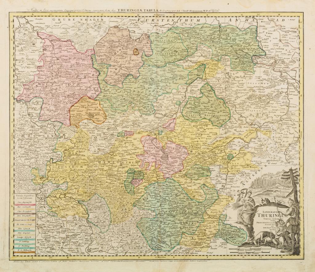 Detailreiche Karte der Landgrafschaft Thüringen, figurative Titelkartusche, bezeichnet "Landgraviae Thuringiae Tabula Generalis [...]", "1729". Hinterklebte Bugfalte und hinterklebter Riss, am Rand geknickt, fleckig und etwas stockfleckig.