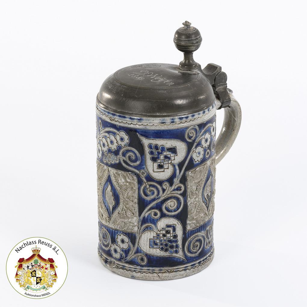 Zylinderkrug mit spitz ausgestrichenem Bandhenkel. Gewölbter Zinndeckel mit Kugeldrücker, graviert "J D Weisen 1819", innen gepunzt.. Alters- und Gebrauchsspuren, Rand mit Abschlag, Wandungsrisse.