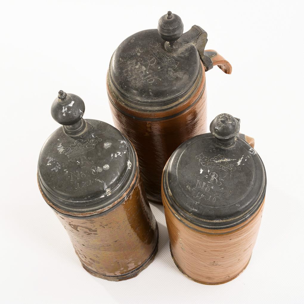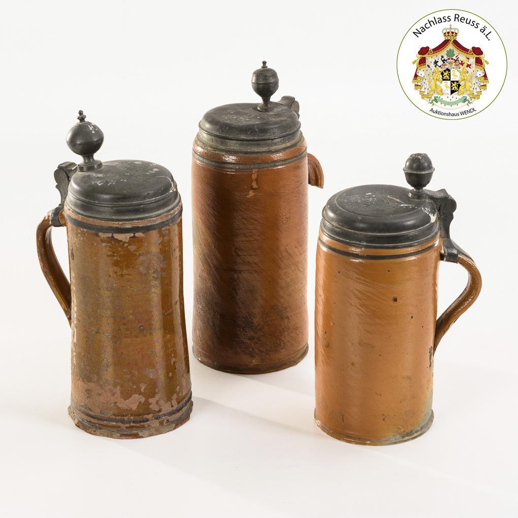 3 barocke Walzenkrüge mit Zinndeckeln. Wohl Altenburg.