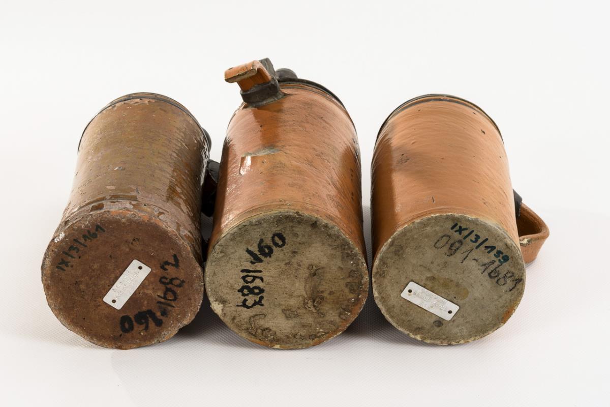 Steinzeug, rotbraun salzglasiert. H 22,5 bis 26 cm.