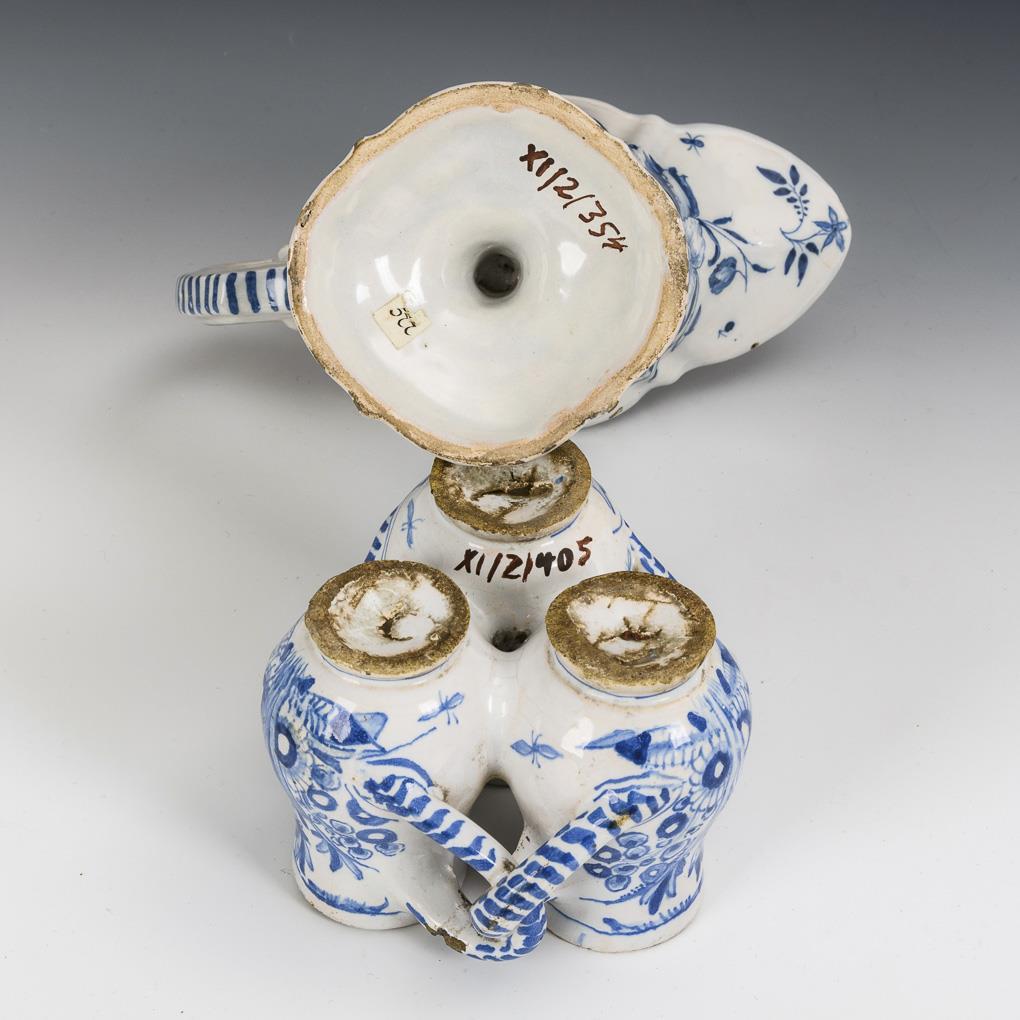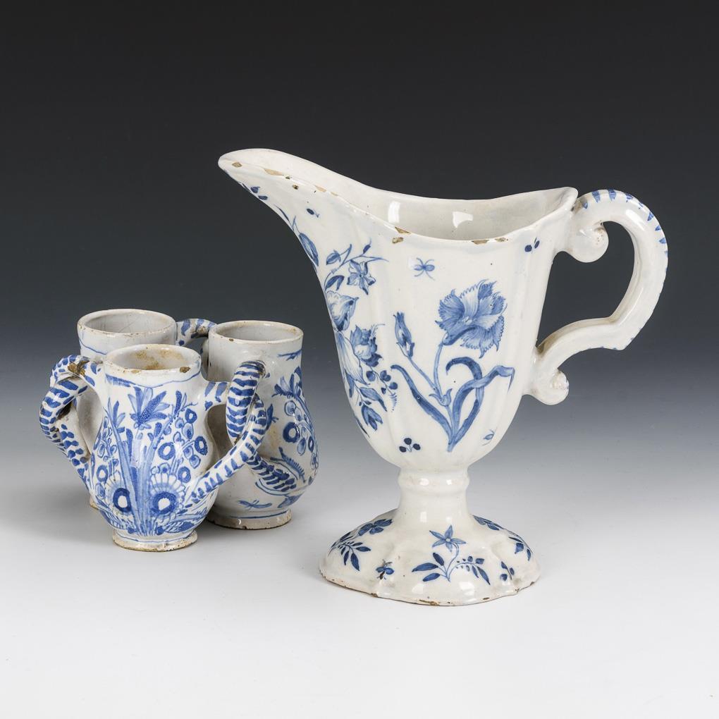 Barocke Fayence-Helmkanne und Drillingsbecher.