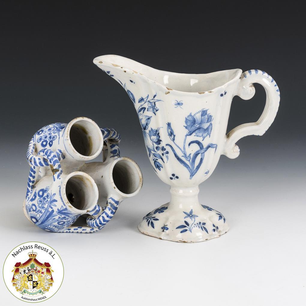 Helmkanne mit Rocaillehenkel und vierpassigem Fuß, H 18,5 cm. "Dreibruderkrüglein" aus 3 zusammenhängenden, birnförmigen Körpern mit verschlungenen Henkeln, H 9 cm. Jeweils mit floraler Bemalung. Leichte Alters- und Gebrauchsspuren, partiell kleine Defekte.