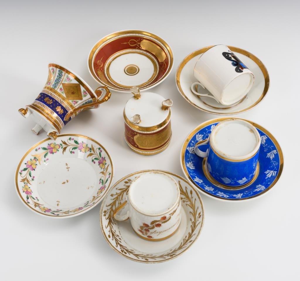 Französische Tatzenfußtasse mit Perlbändern, rotbraunem Fond und radierter Goldstaffage. / Kratertasse mit Tatzenfüßen, Rosettenhenkel, mattblauem Fondband und Blumenmalerei. / Zylindertasse mit blauem Fond und dem schauseitigen, bekrönten Monogramm"C.B." (von Buttlar?). / Zylindertasse mit Wappendarstellung. / Zylindertasse mit der schauseitigen Aufschrift "Die Hand der Freundschaft reicht es Dir". 4 Tatzenfüße bestoßen, Bestoßung an 1 Tassenrand, 1 Tasse mit Haarriss, partieller Goldabrieb.