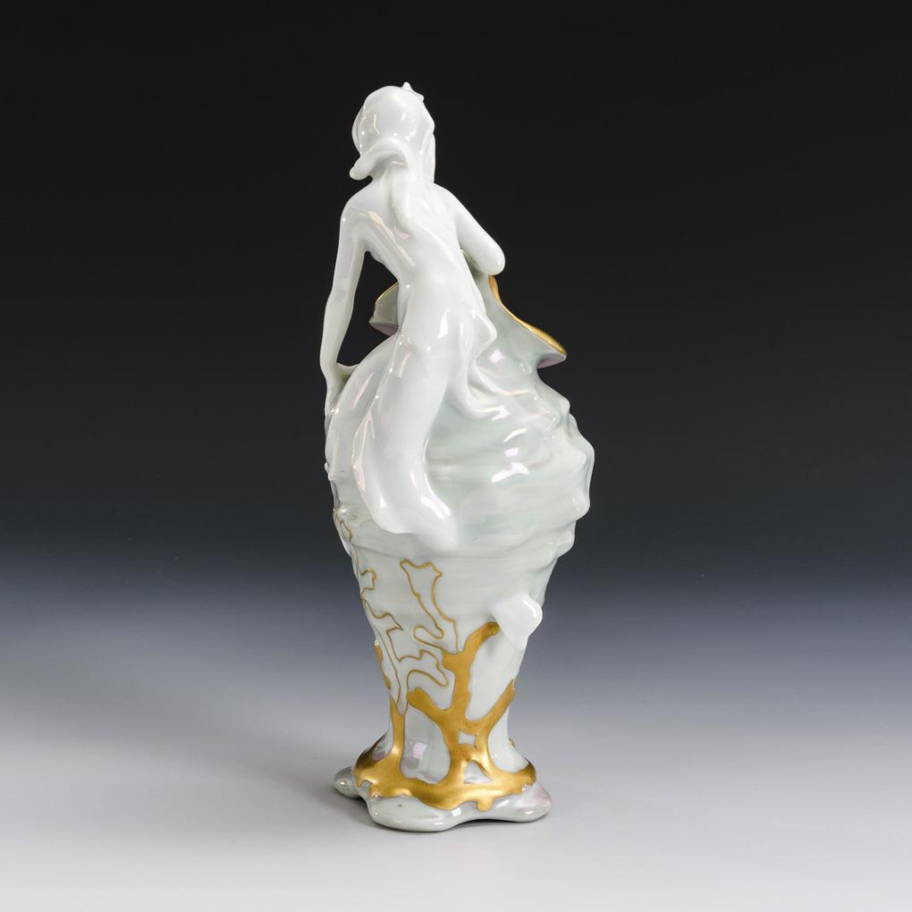 Muschelförmiger Korpus mit einer auf der Schulter sitzenden Nymphe. 1 minimale Bestoßung an 1 Nixenschwanz, 1 kleine Restaurierung an der Spitze der Schwanzflosse.