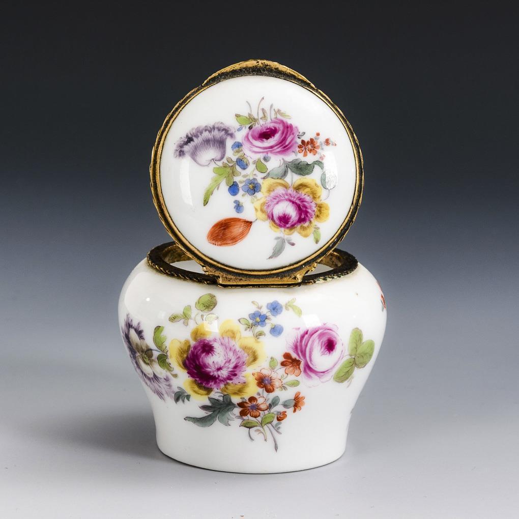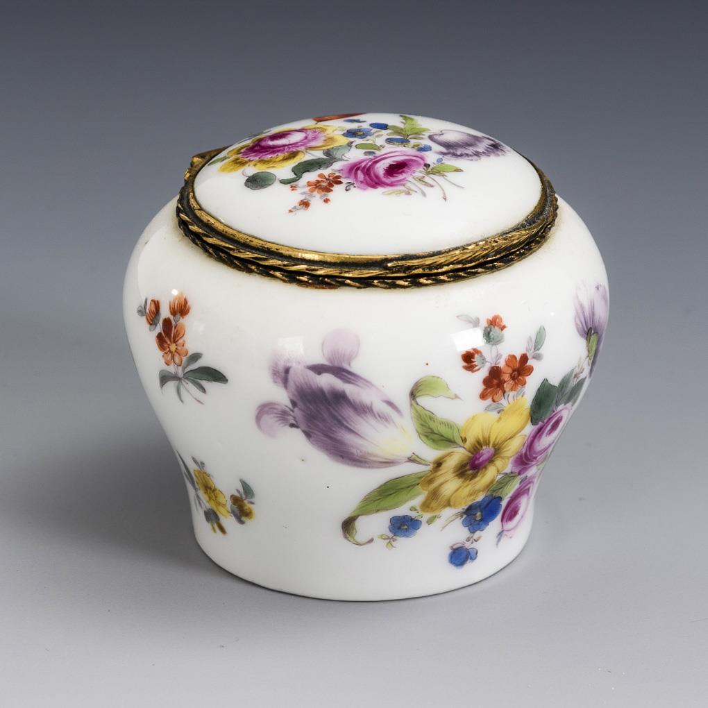 Balusterdose mit metallmontiertem Scharnierdeckel. Bemalt mit Blumenbuketts und Streublümchen.