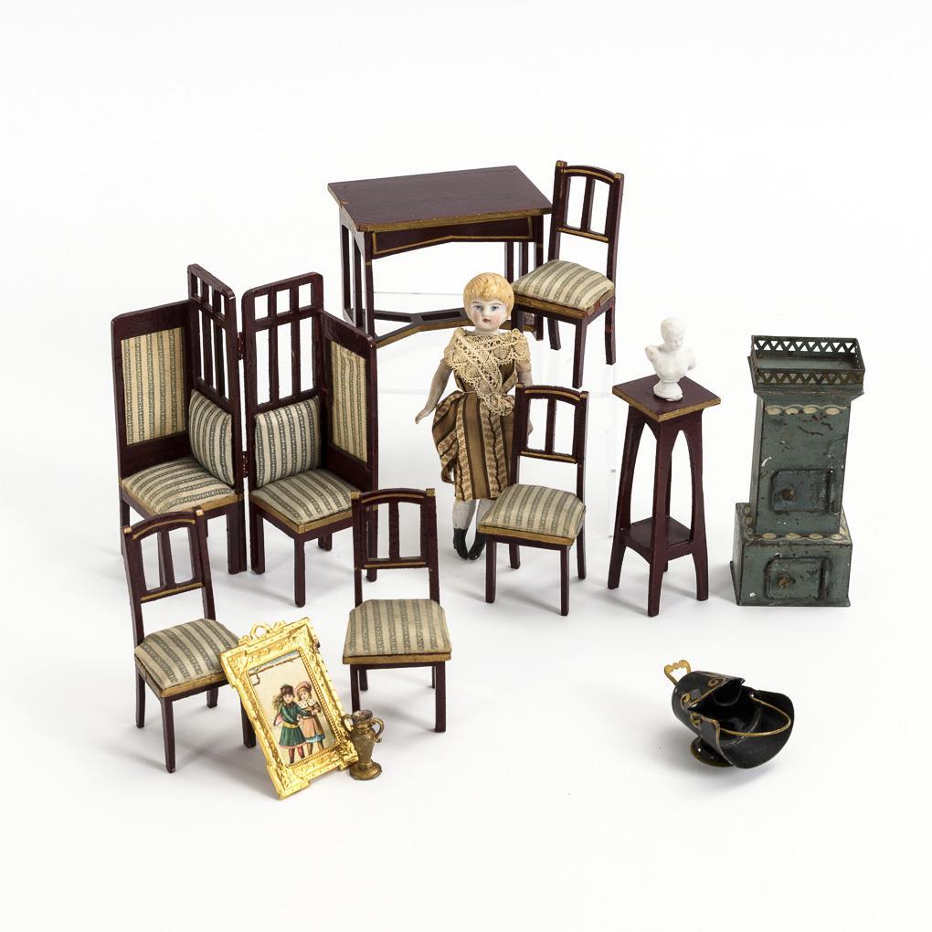 7 elegante Gottschalk-Salonmöbel und Blechofen für die Puppenstube.