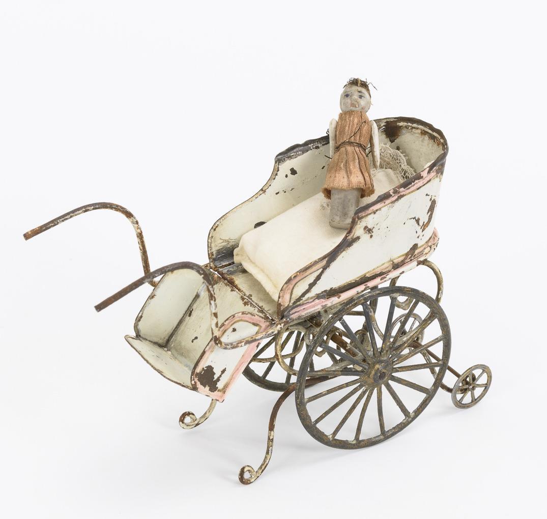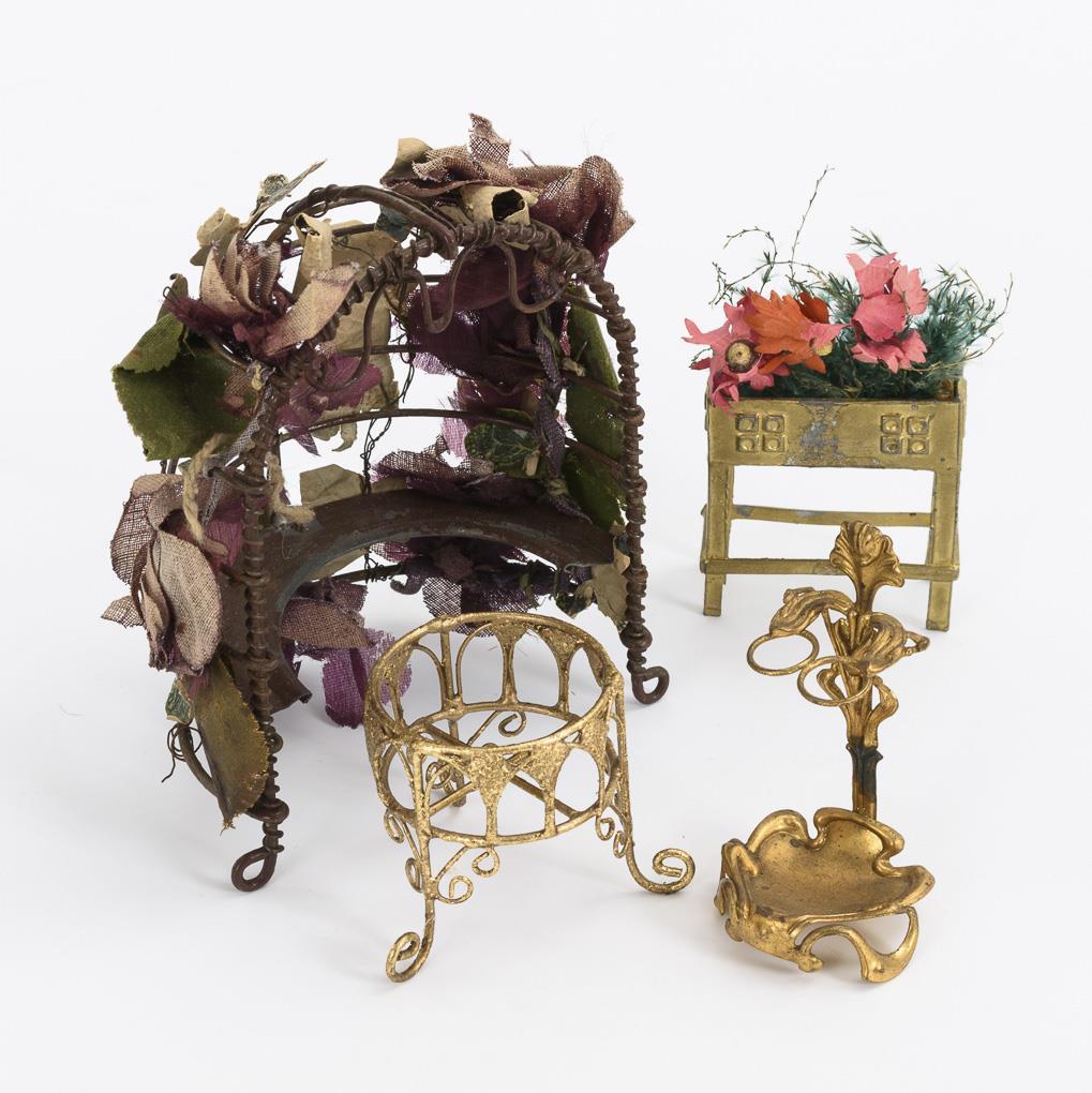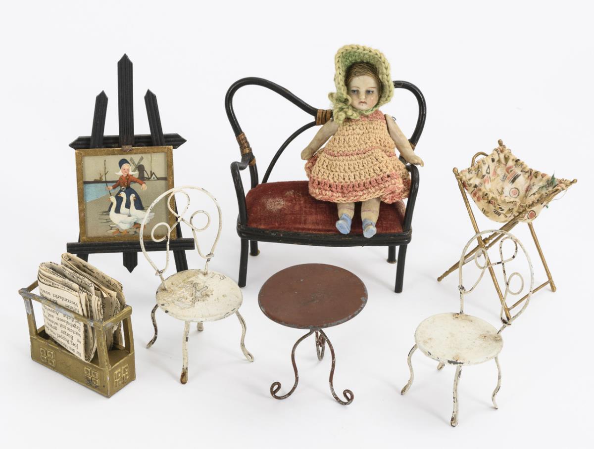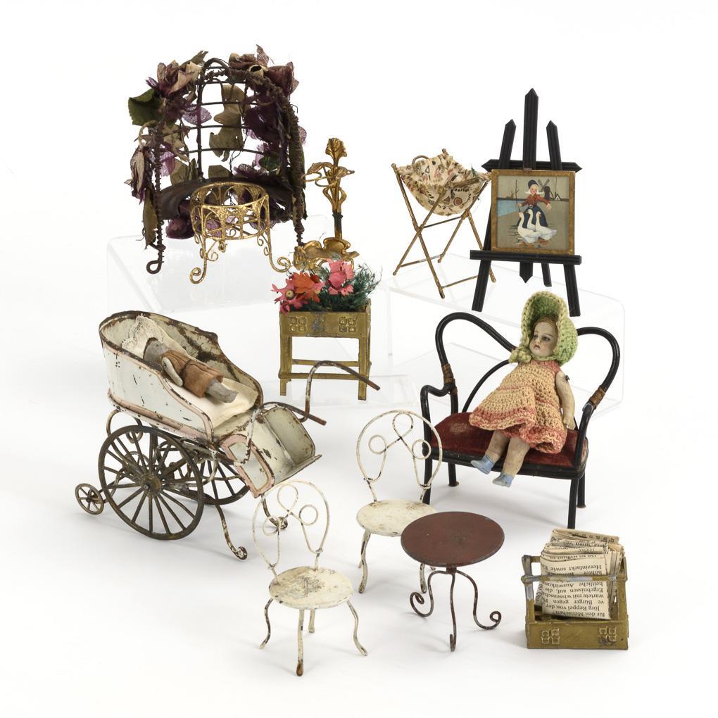 Verschiedene Teile für den Garten und die Puppenstube: Tisch, Bank, 2 Stühle, Blumenkasten, Zeitungsständer, Staffelei, Blechpuppenwagen, 2 Püppchen etc. Altersspuren und Defekte.