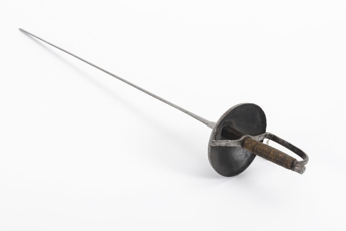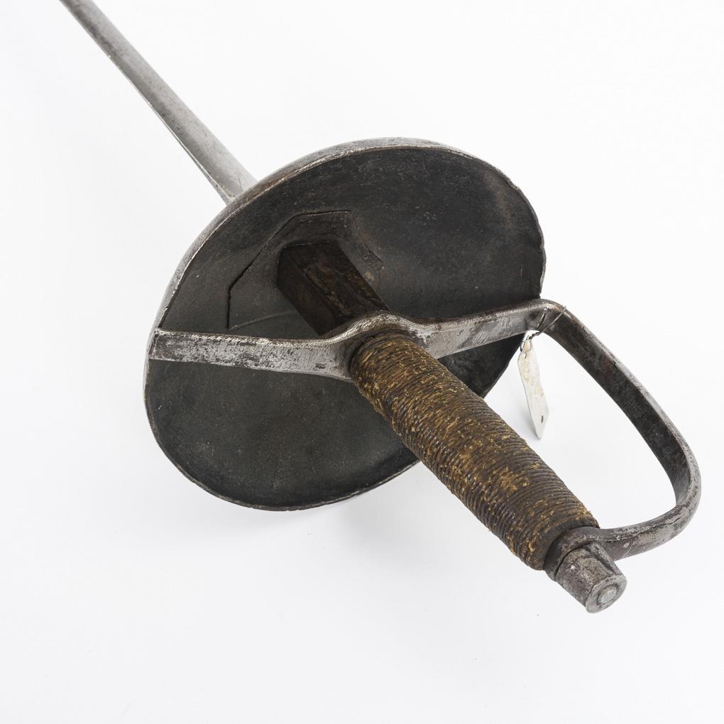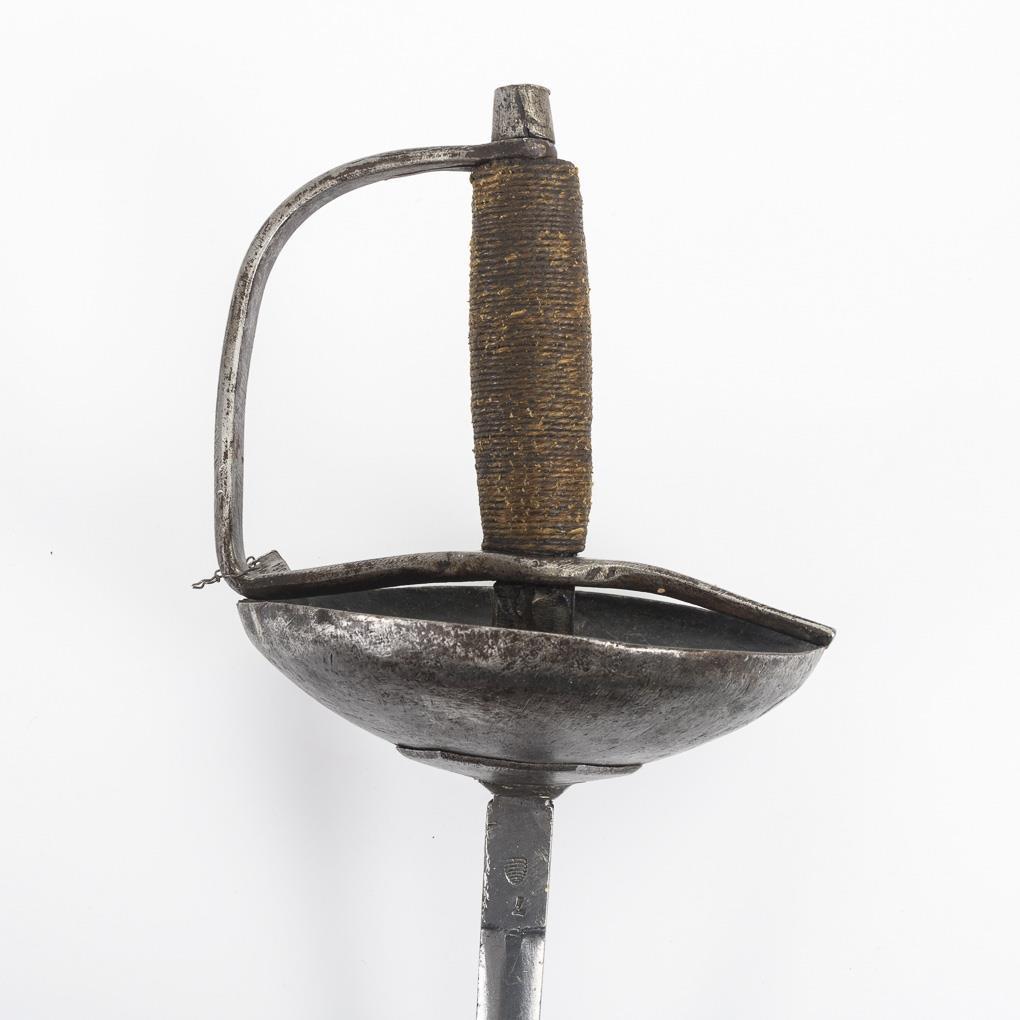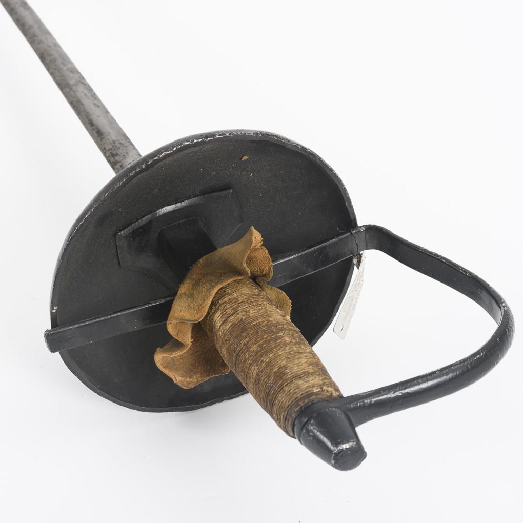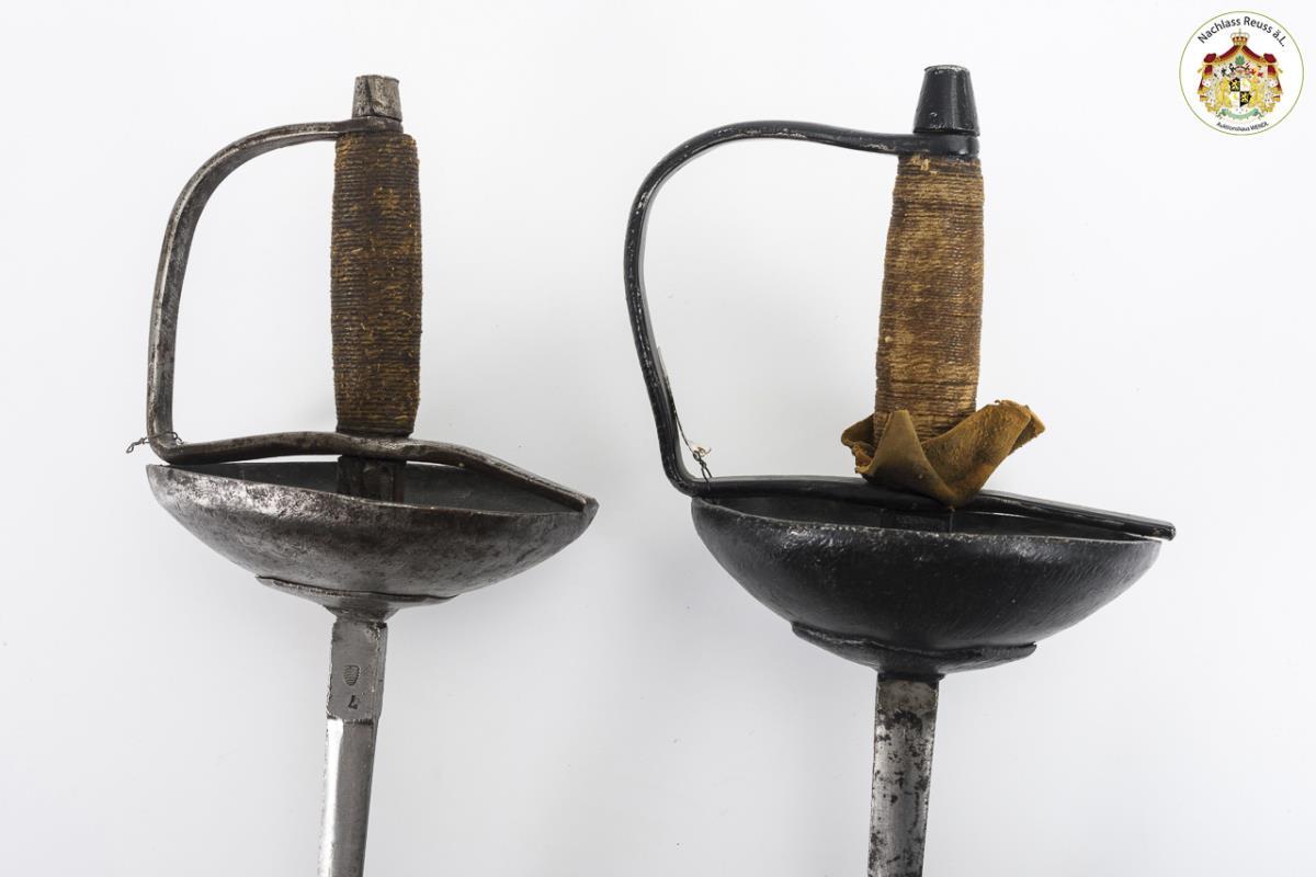 Eine Klinge gemarkt mit Bienenkorb und "7" und abgebrochener Spitze. Andere mit schwarz gefasstem Griffbügel und Faustschutz. Beide mit Strickwicklung. Alters- und Gebrauchsspuren.