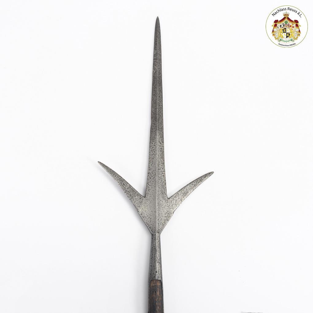 Dreispießige Stichwaffe mit zwei langen Wangen zur Befestigung am Schaft. Holzschaft jünger ergänzt. Früher konservatorisch behandelt.