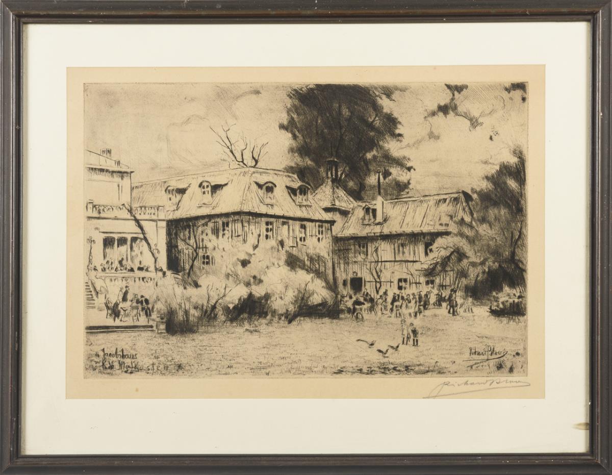 Darstellung des Düsseldorfer Jacobihauses, welches seit 1867 das Gesellschaftshaus des Künstlervereins "Malkasten" ist, dem Richard Bloos angehörte. Minimal stockfleckig.