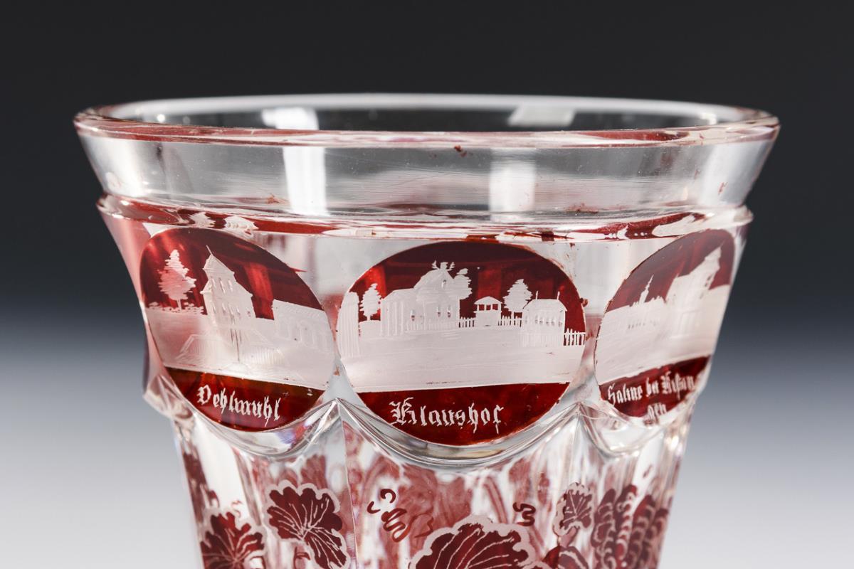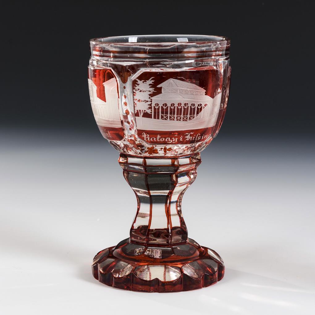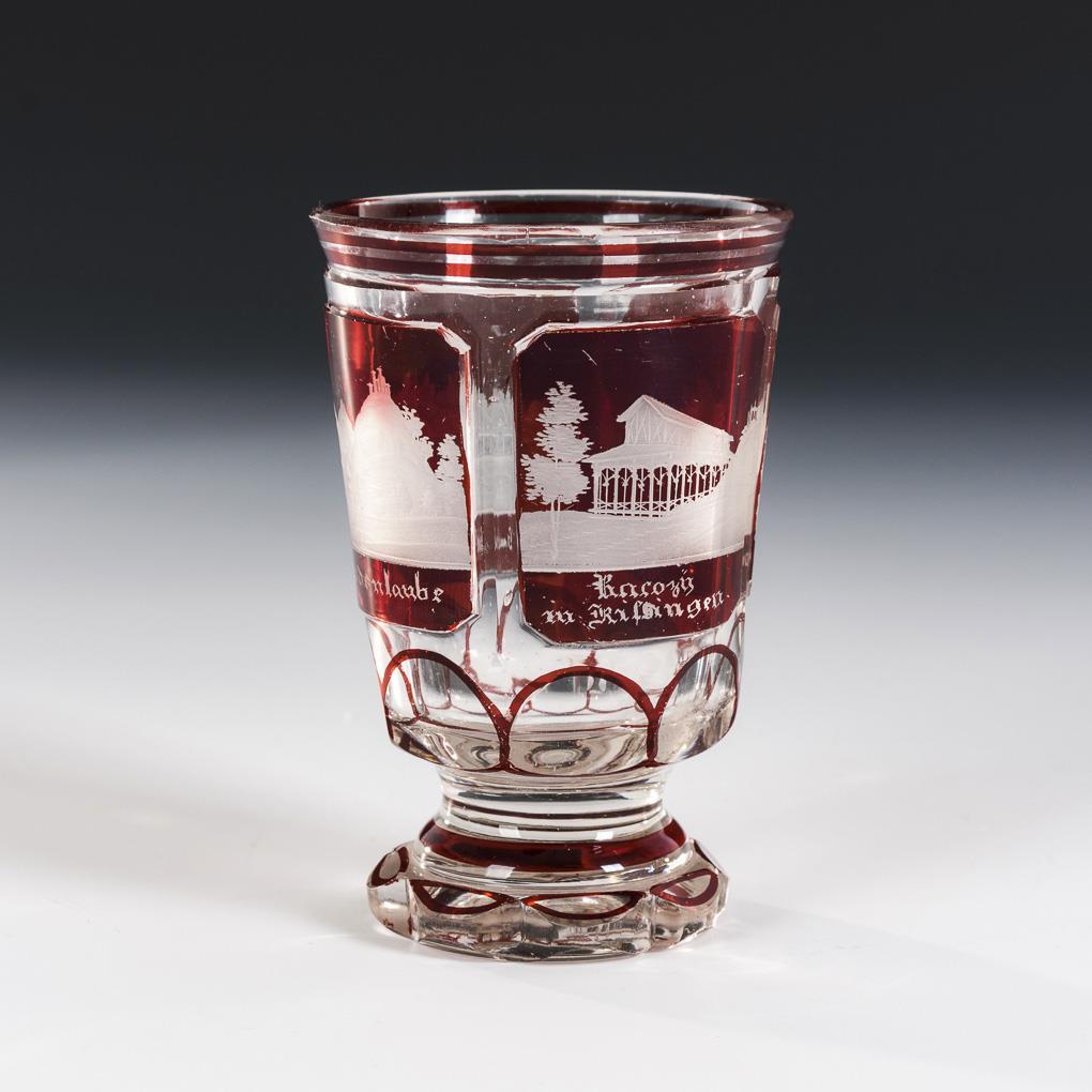 Facettierter Kraterbecher, Kelchglas und Fußbecher. Alle mit gravierten, bezeichneten Ansichten von Bad Kissingen. Partiell berieben, minimale Bestoßungen an den Fußrändern.