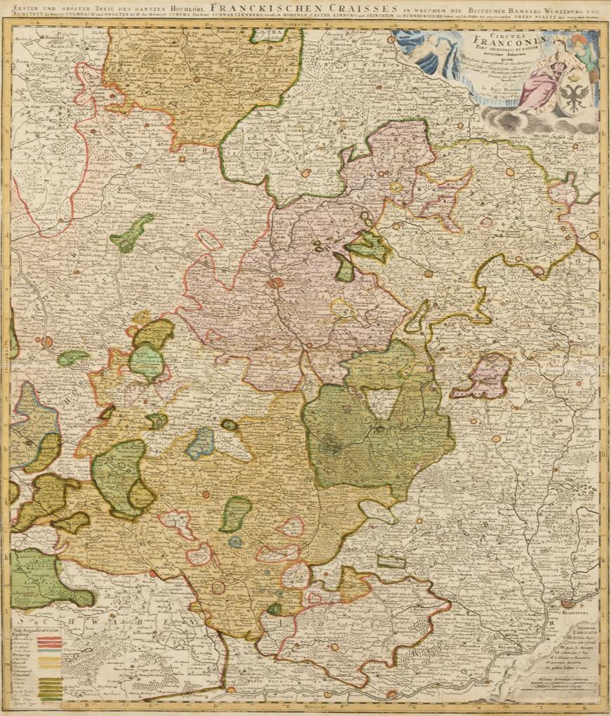 Detaillierte Karte des Fränkischen Reichskreises, mit figürlicher Titelkartusche "Circuli Franconiae", bezeichnet "Erster und gröster Theil des gantzen Hochlöblichen Franckischen Craisses [...]". Bugfalte, stockfleckig, knickspurig.