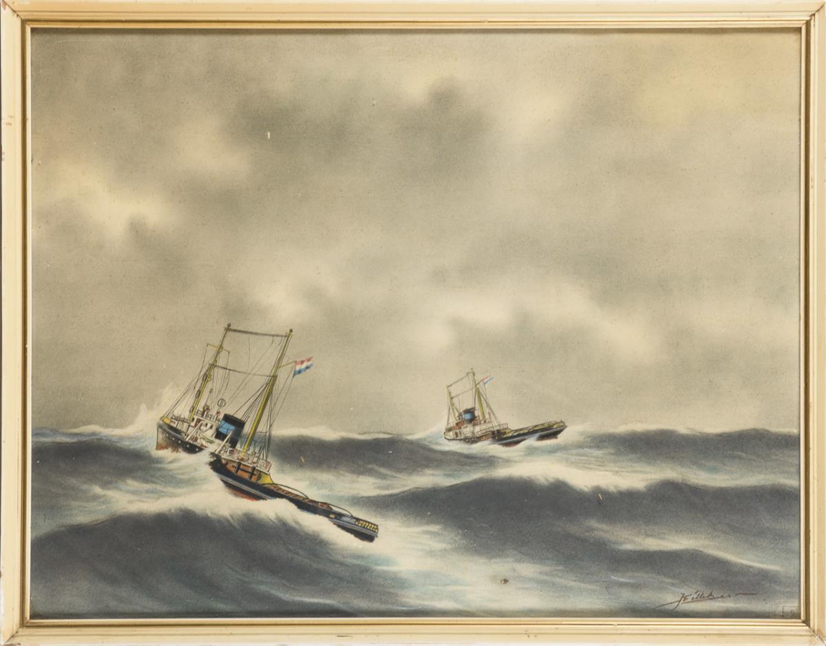 Undeutlich signiert: Zwei holländische Schlepper bei starkem Wellengang