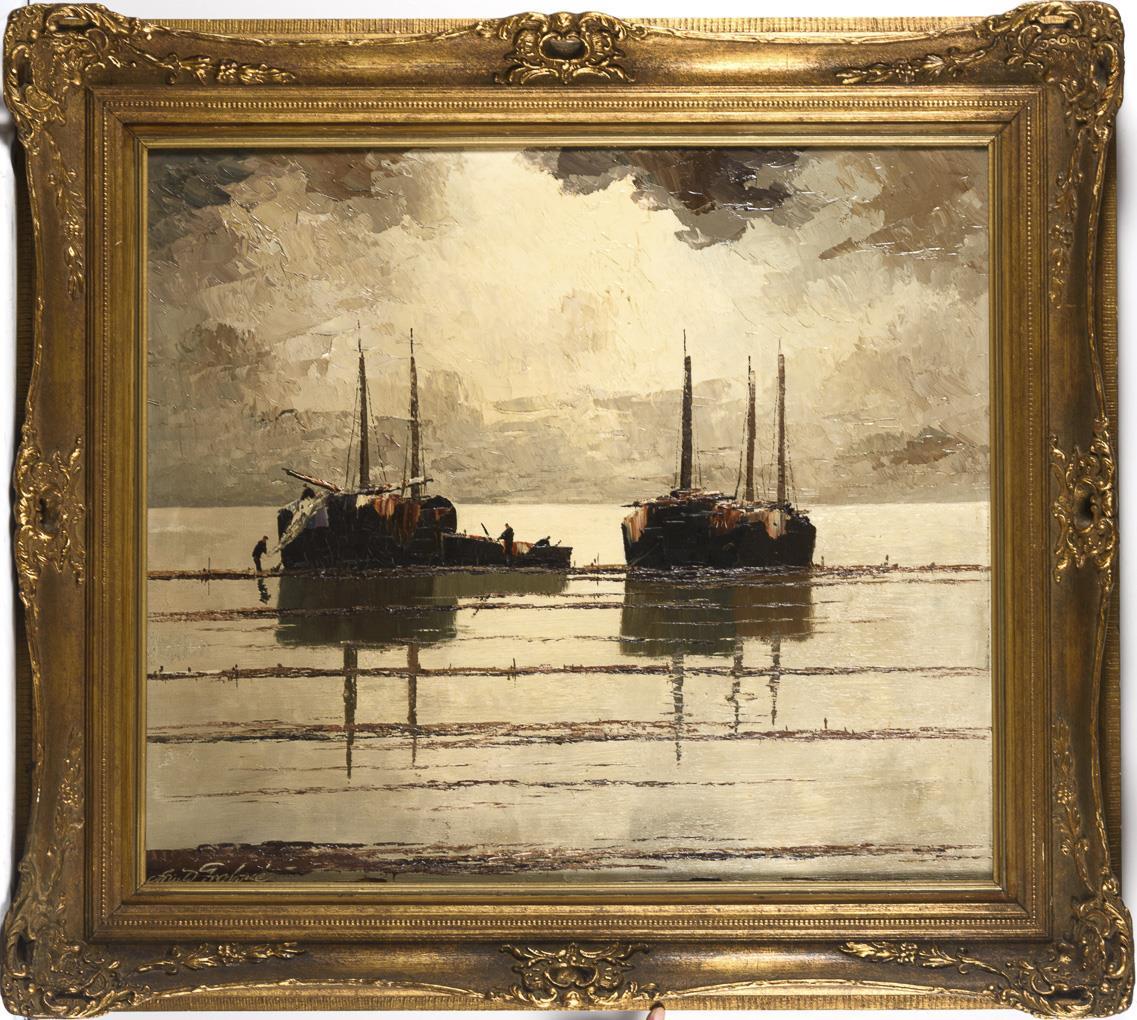 Fischerboote im Haff bei fahlem Licht unter wolkigem Himmel. Altersspuren.