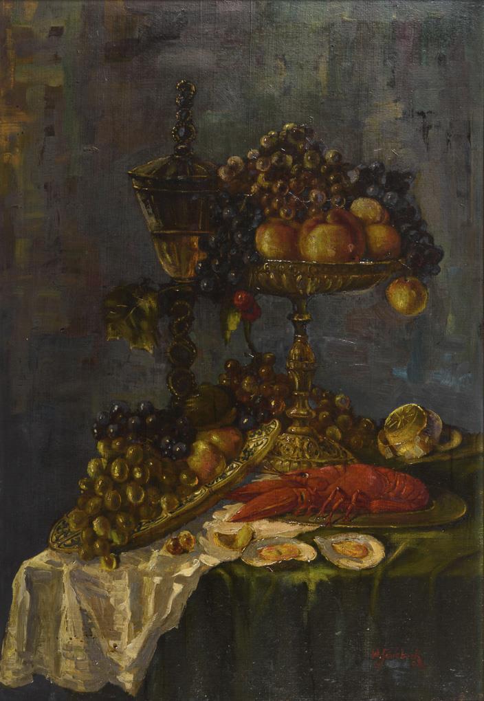 Hummer und Austern neben Trauben und Äpfeln auf prunkvollen Gefäßen. Leichte Altersspuren.