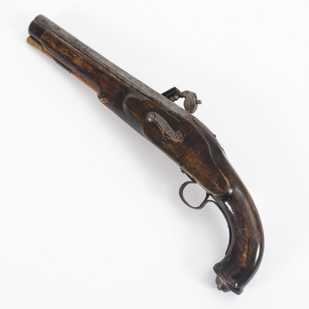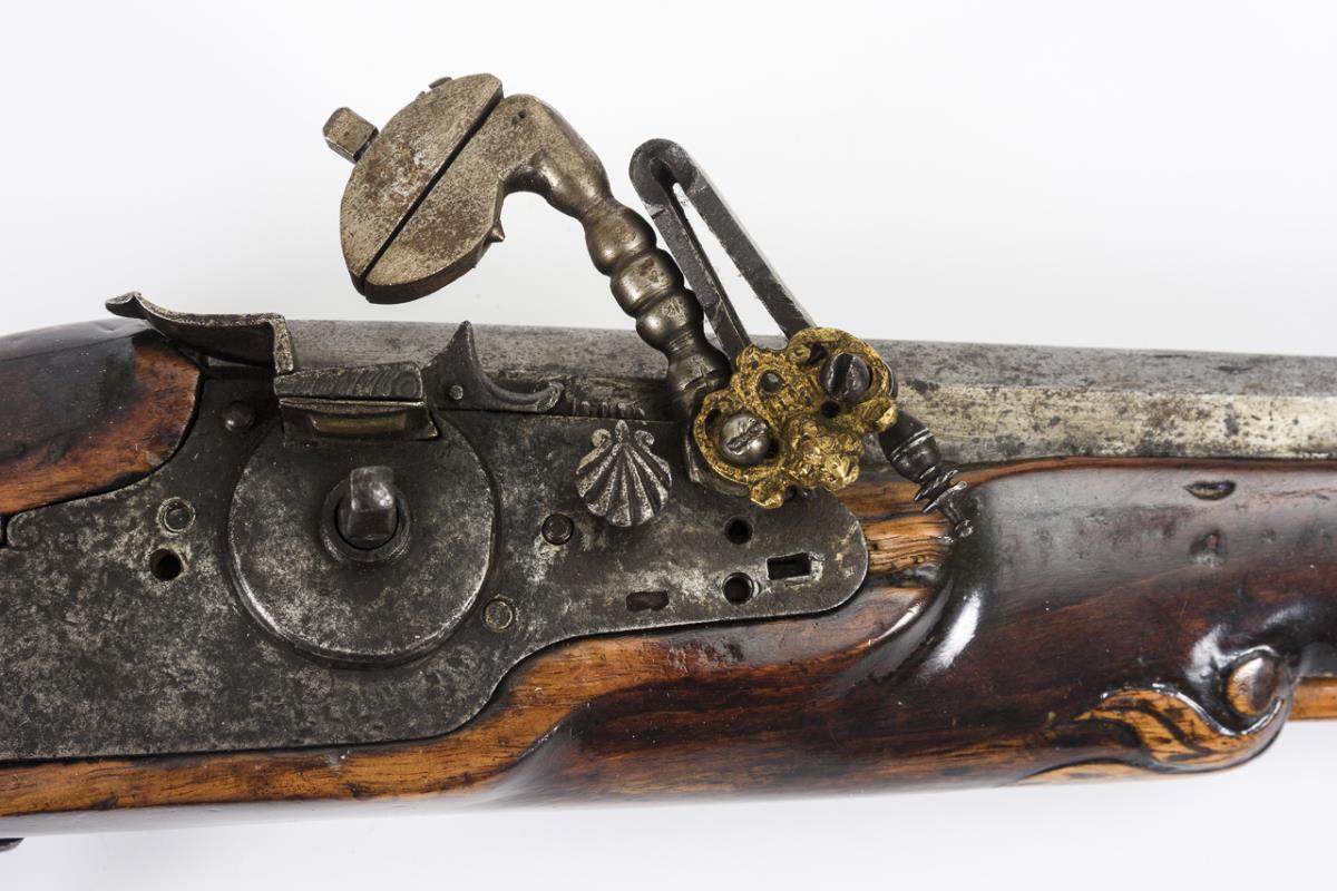 Lauf mit großem Kaliber zu 2/3 sechskantig gearbeitet. Schloßplatte mit Frauengestalt und "Prudencia". Pfannenschieber und Schließmechanismus funktionieren. Hahn wohl jünger ergänzt und verbogen, Abzugsschutz wohl jünger. Holzschaft mit floralem Ornament am Ladestockeinschub, lackiert. Älterer Ladestock abgebrochen. Verbindungen teils lose oder mit ergänzten Schrauben.