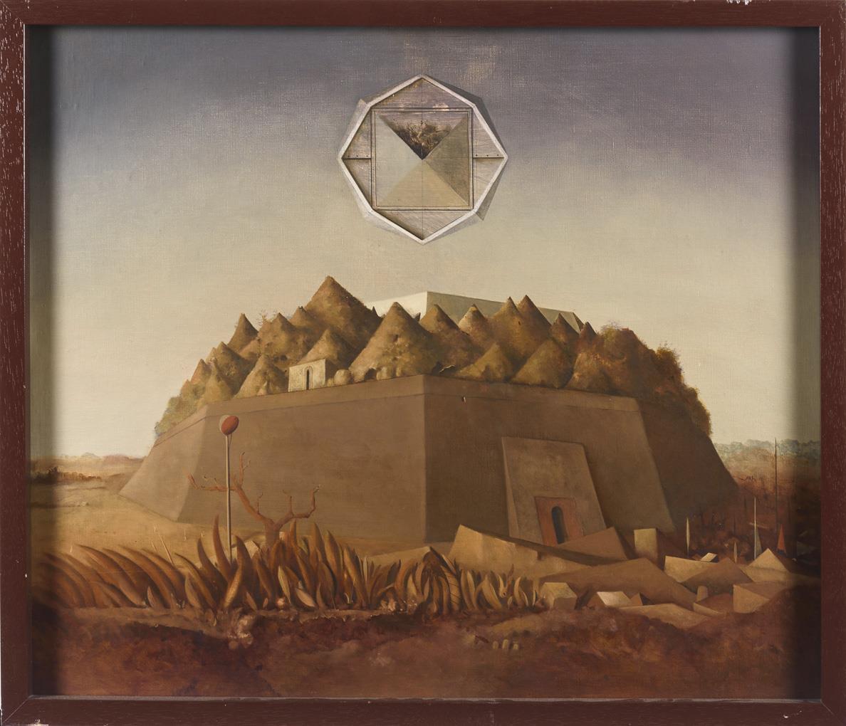 Surrealistische Landschaft mit bergiger Landschaft hinter hohen Mauern in weiter Ödnis mit Trümmern.